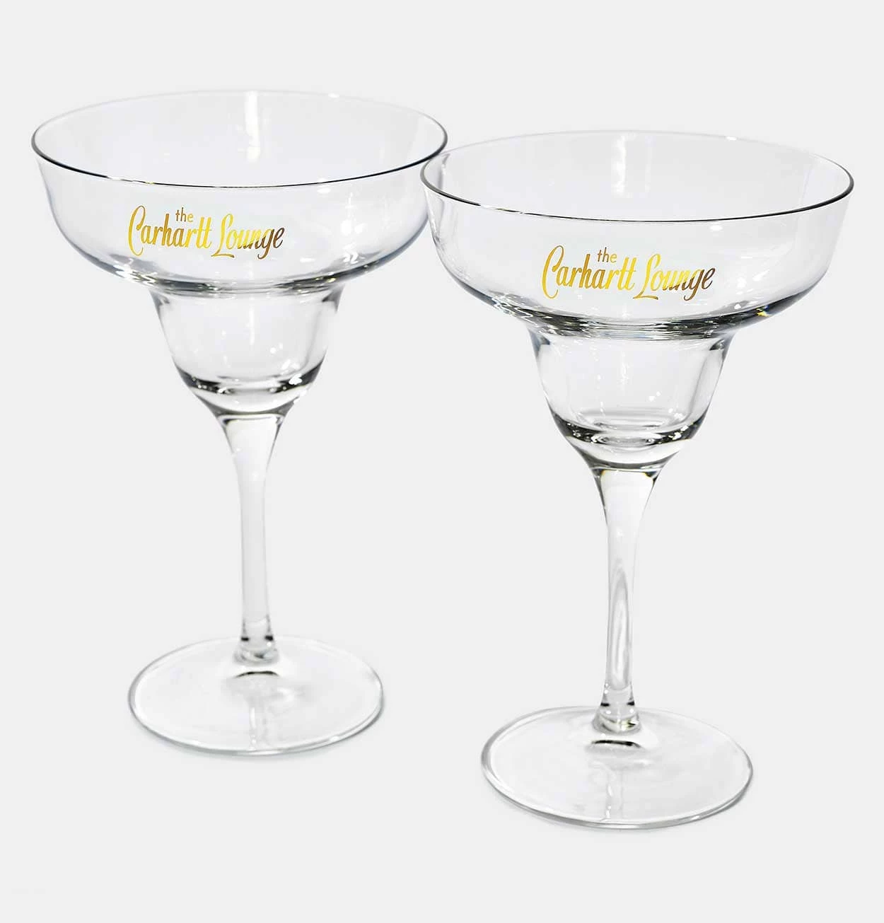 The Carhartt Lounge Glass Set is a set of two margarita glasses that are finished with a gold graphic print.