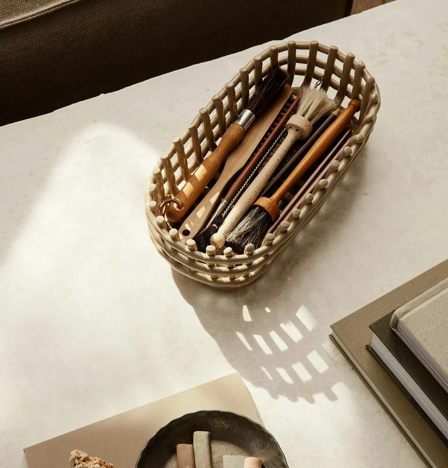 Bringing the traditional basket weaving technique to pottery, our handmade Ceramic Baskets recreate the familiar feel of woven containers. This multifunctional design can be placed in any room and is the ideal storage solution for cherished objects. Sculpted by hand and artfully uneven, no two pieces are the same.