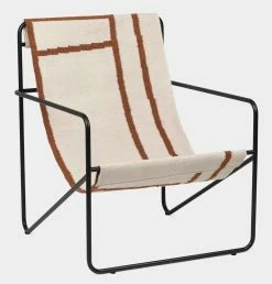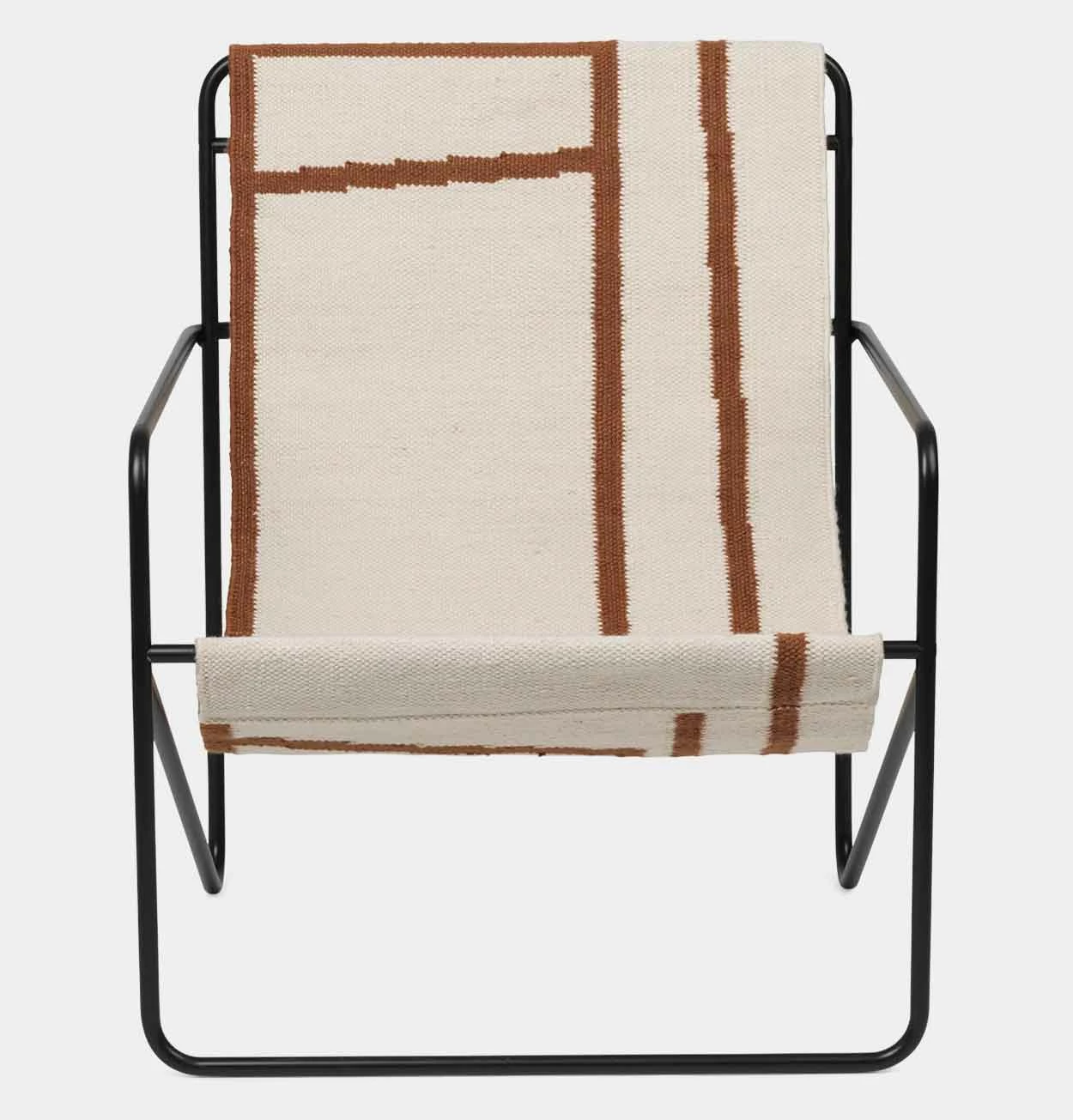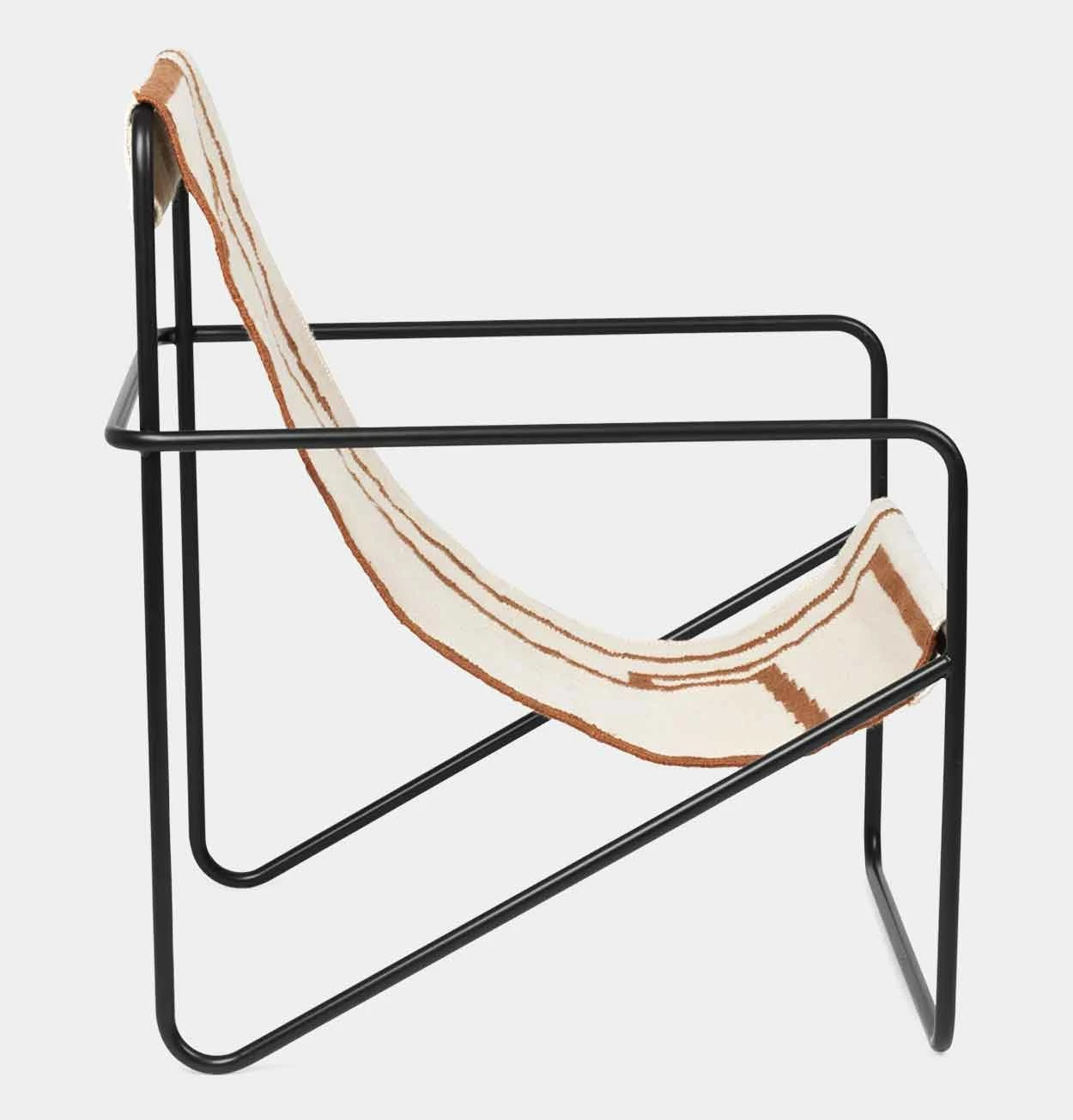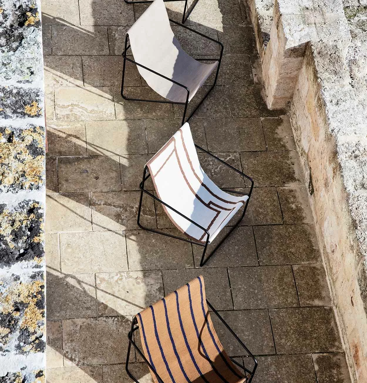 A Modernist chair with a graceful profile, Desert Chair is crafted from a tubular powder-coated steel frame in colours Black or Cashmere, holding an interchangeable woven textile seat made from recycled plastic bottles.