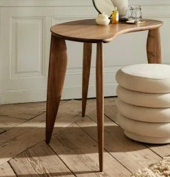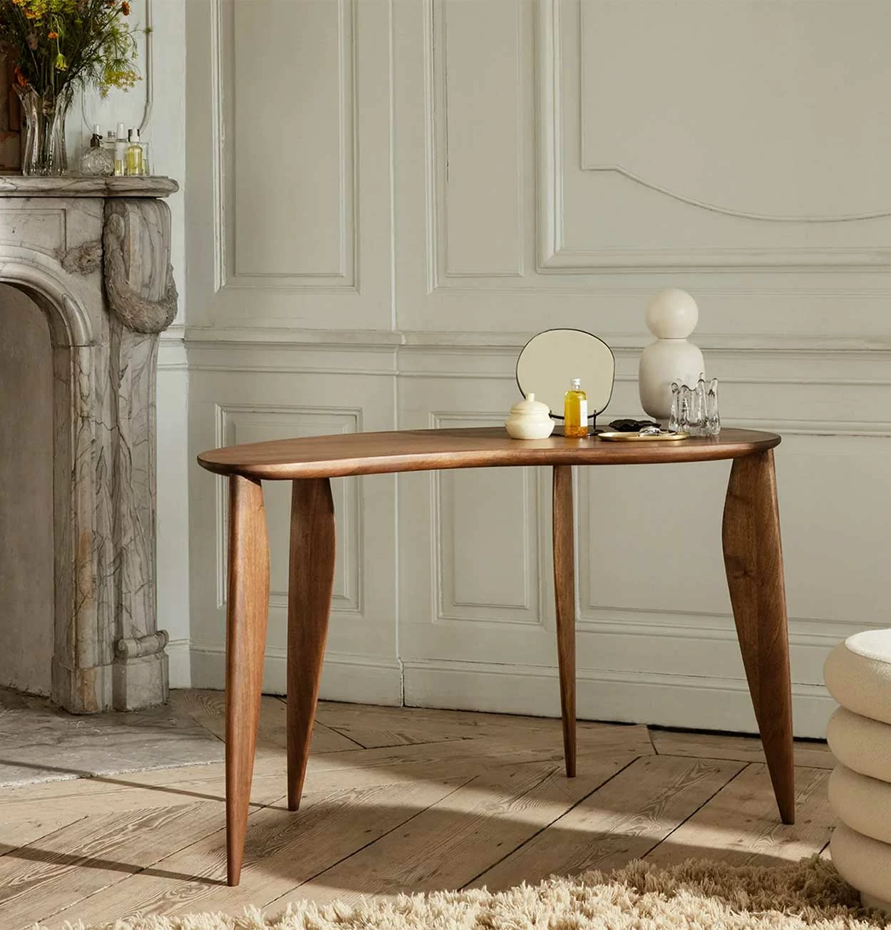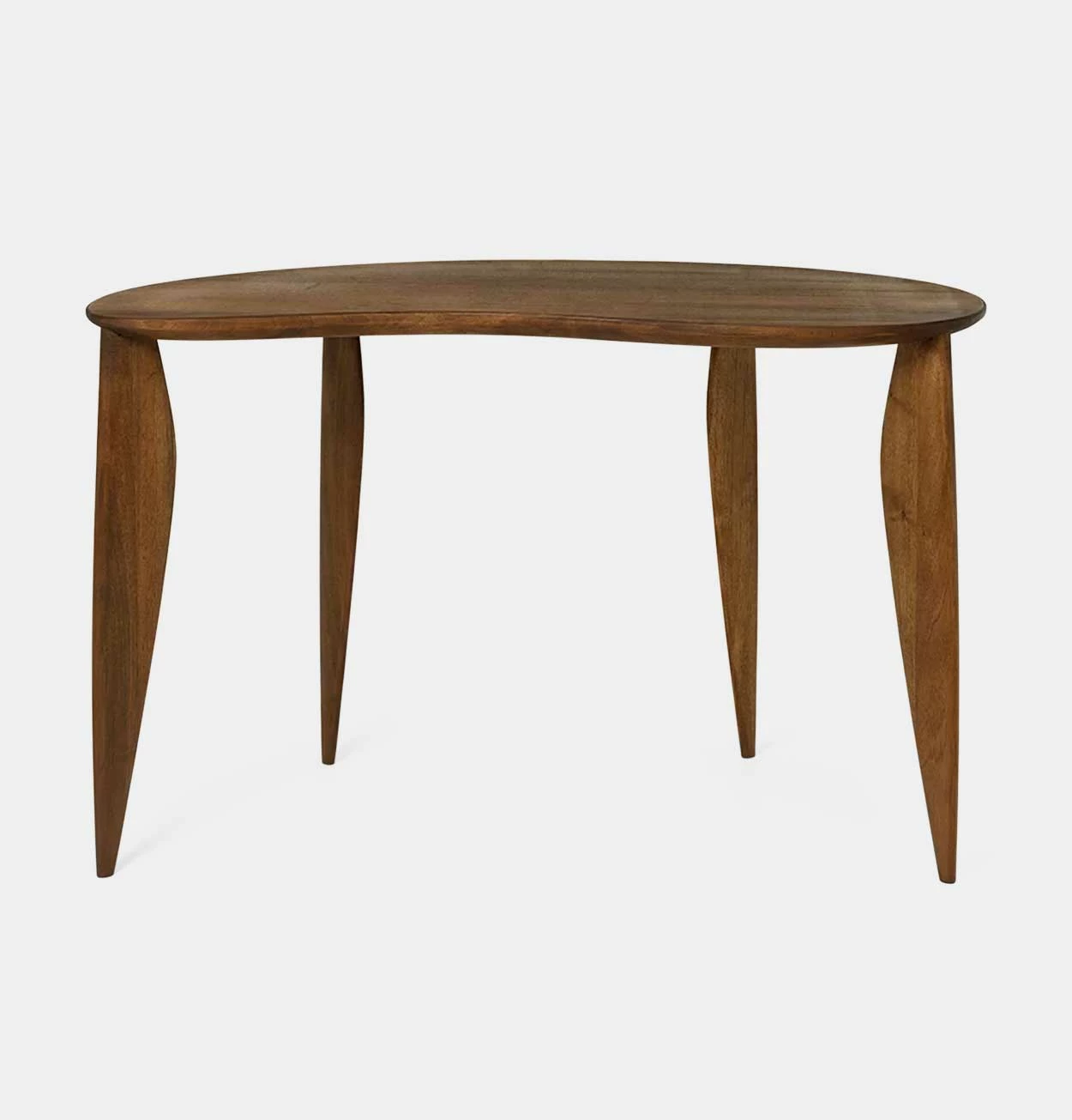 Made in solid FSCβ’-certified European Walnut, the Feve Desk has an organic, delicate expression. As a reference to the distinctive shape, its name comes from the French word FΓ¨ve, which means bean. The legs are carved into stretched elliptical shapes that emphasise the deskβs elegant, feminine silhouette and balance the design. The Feve Desk requires little space and can be used both as a desk, an entrance console or a make-up table.