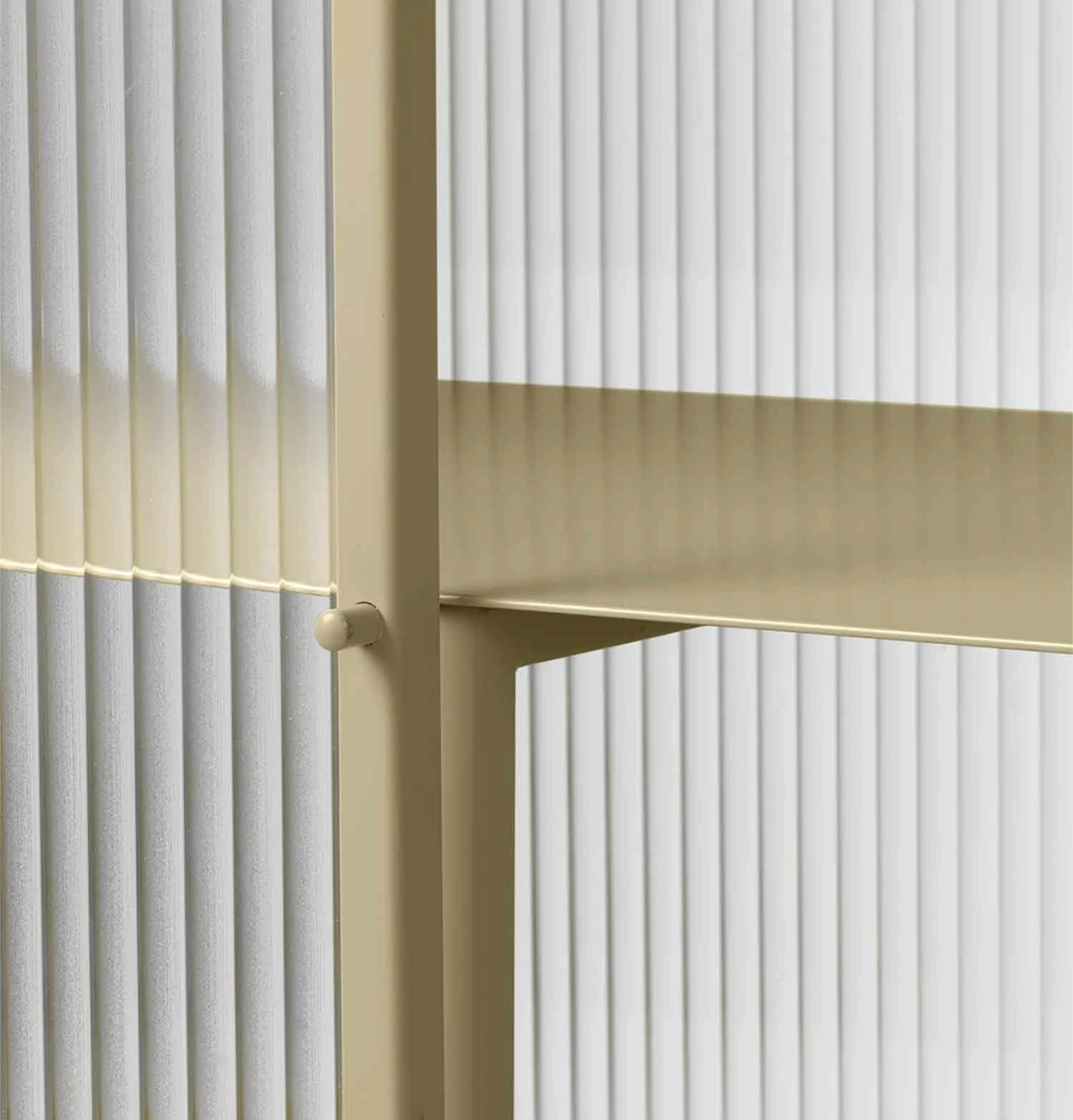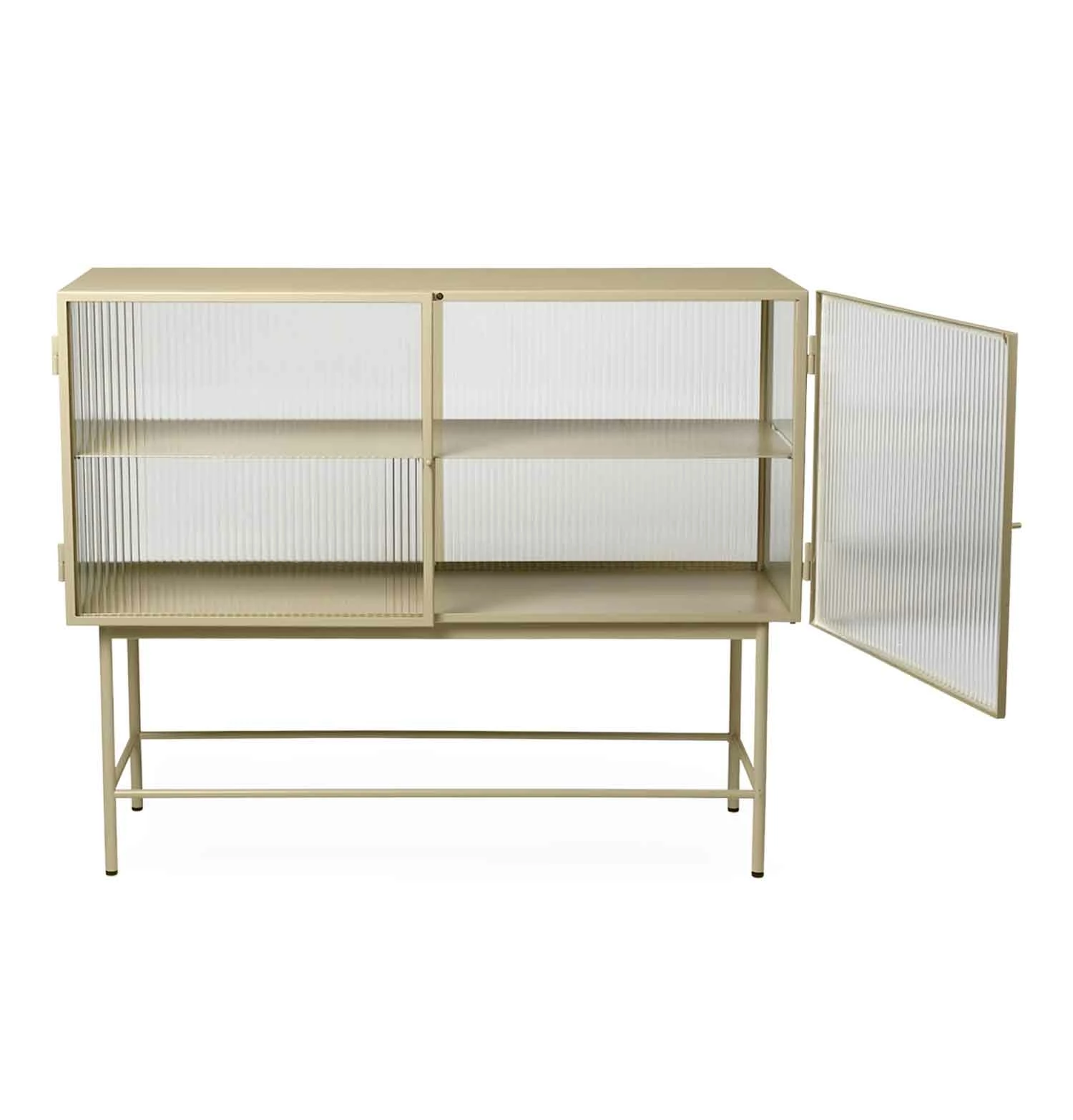 Perfect for concealing clutter in a busy hallway or as an elegant storage solution for a home office, bathroom or dining room, the sleek metal frame of our Haze Sideboard blends seamlessly into any interior style. Corrugated glass walls and doors continue the sophisticated expression, blurring the cupboardβs contents from prying eyes.