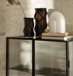 Opposites attract on this cabinet, crafted from sleek powder coated metal and corrugated glass. The glass doors close seamlessly thanks to magnets, and open to reveal two powder coated metal shelves. Use in the bathroom to stylishly store beauty essentials or as a modern focal point in your dining room to store dinnerware and more.