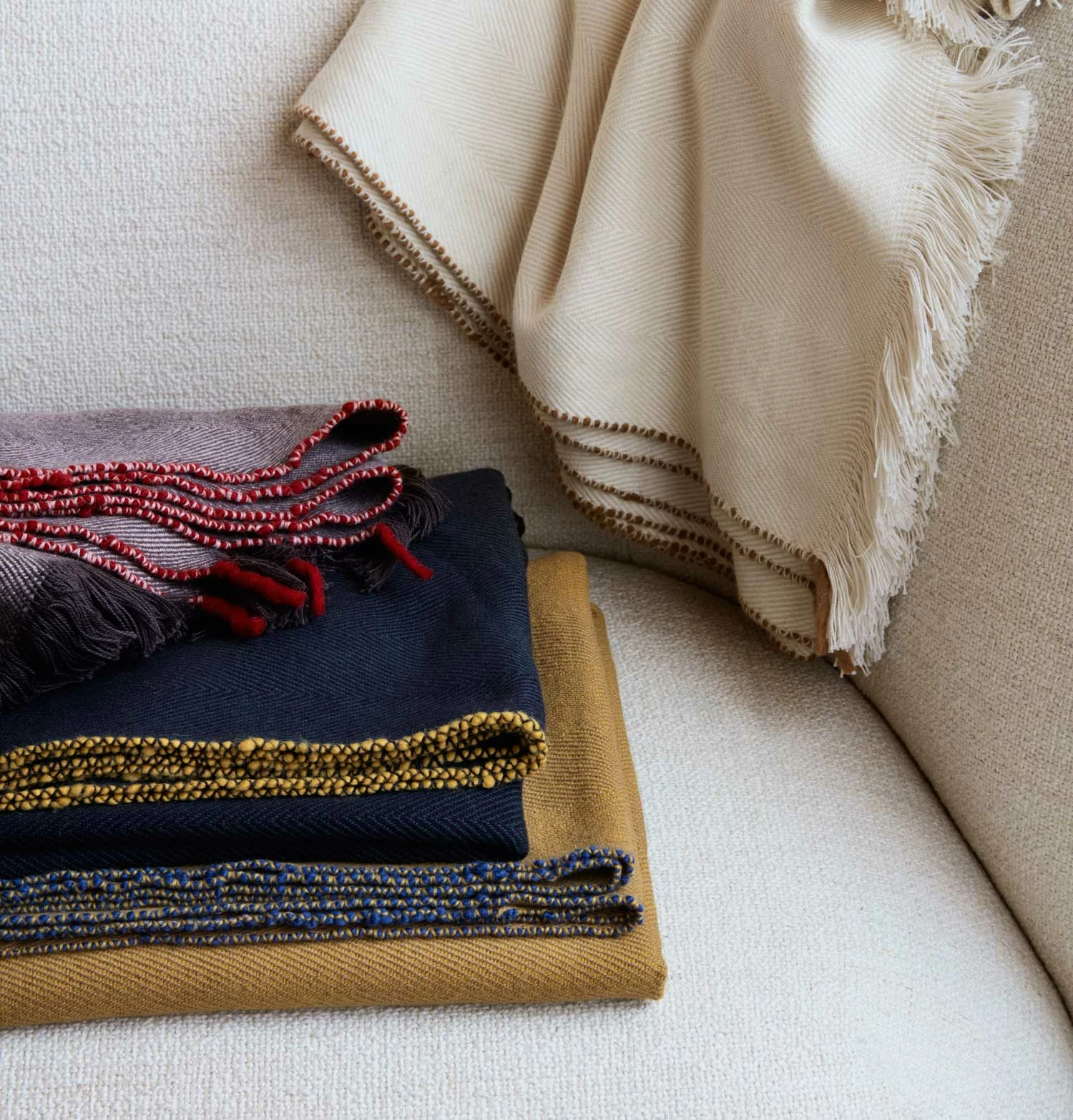 - Double weave herringbone patterns with contrast slub yarn edge detail