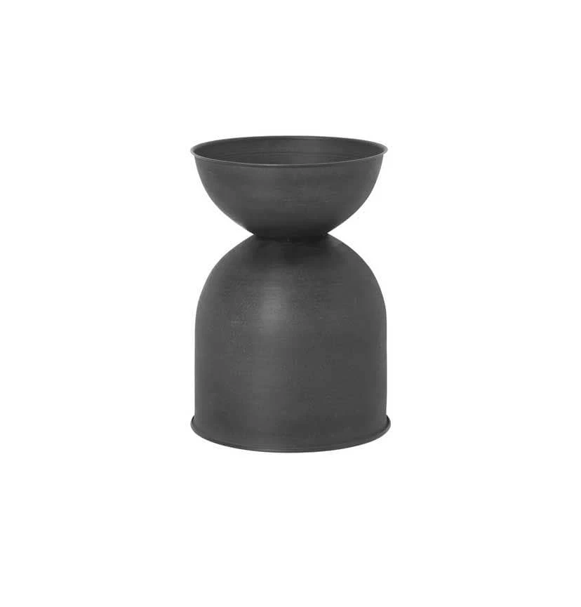 As a grand gesture to your home and plants, the Hourglass Pot gives your plants an elevated stand and roomy container in which to spread their roots. You can use the pot both ways according to the plantβs needs, and no matter which way you turn it you are sure to make a voluminous statement. The pots are made of metal with a matte finish and have been treated to be suitable for outdoor use.