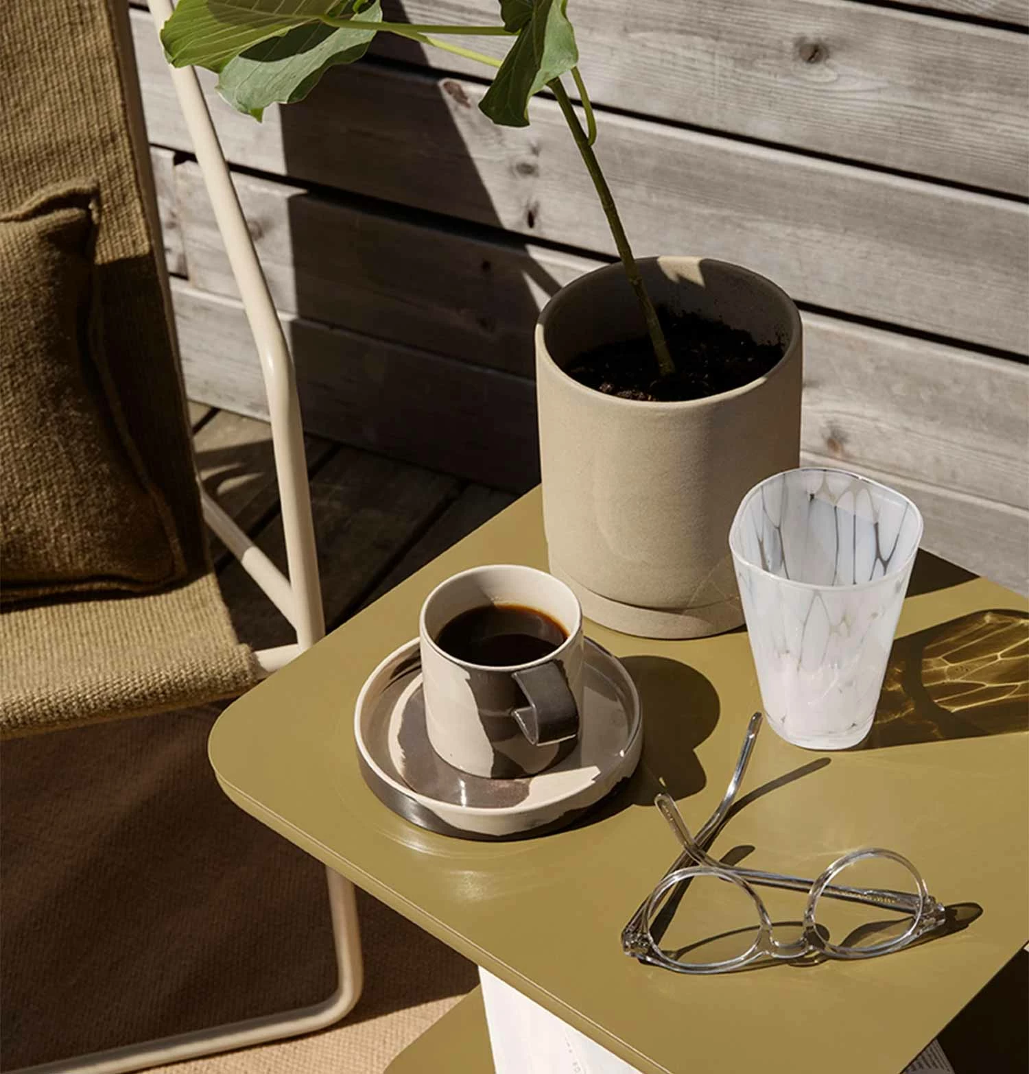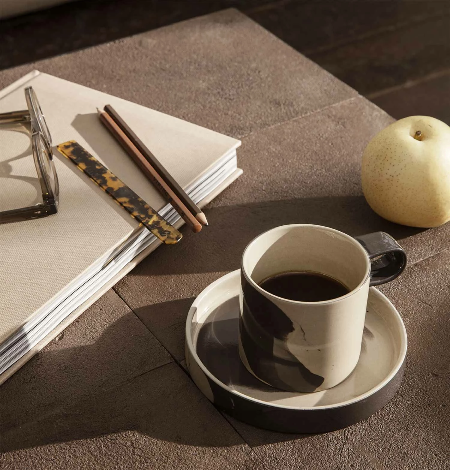 Playing with bold proportions, the Inlay Cup with Saucer is made from stoneware that features a distinctive, two-tone mix of clays that create a large-scale, marble-like pattern, each of which is unique to the individual piece. The purposeful, robust forms of the cup and saucer are pleasantly contrasted by a clear, high-gloss glazing. Use the oversized saucer along with the cup, or as a dish for your morning bread roll or afternoon pastry.