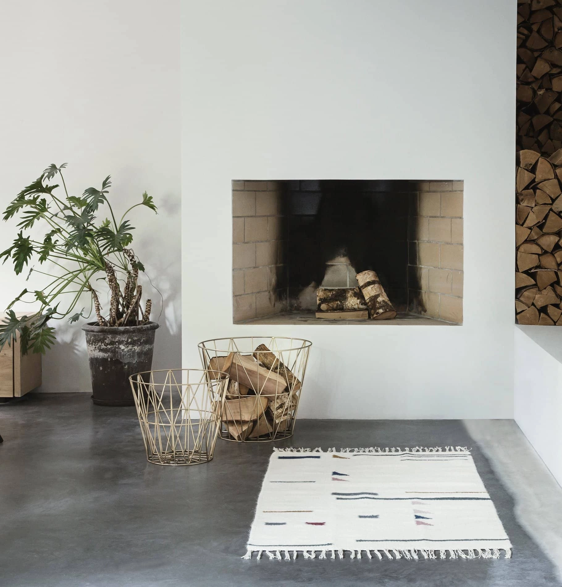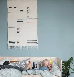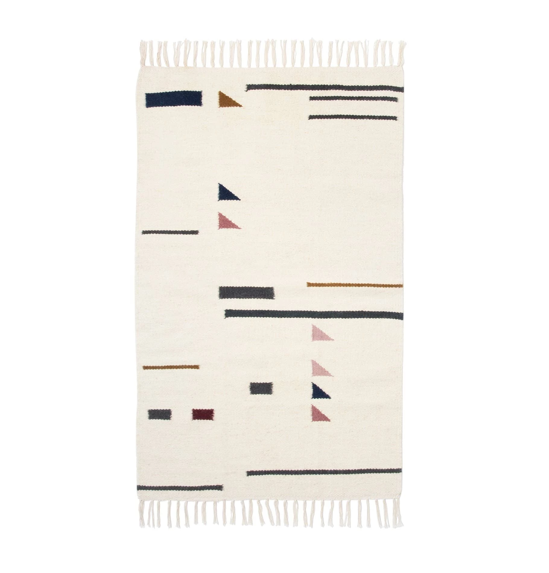 Patterned with graphic forms in a restrained colour palette, this kelim rug has multiple uses. Hang from the wall as a decorative element in a room, throw over the back of your sofa or place on the floor in your chosen room.