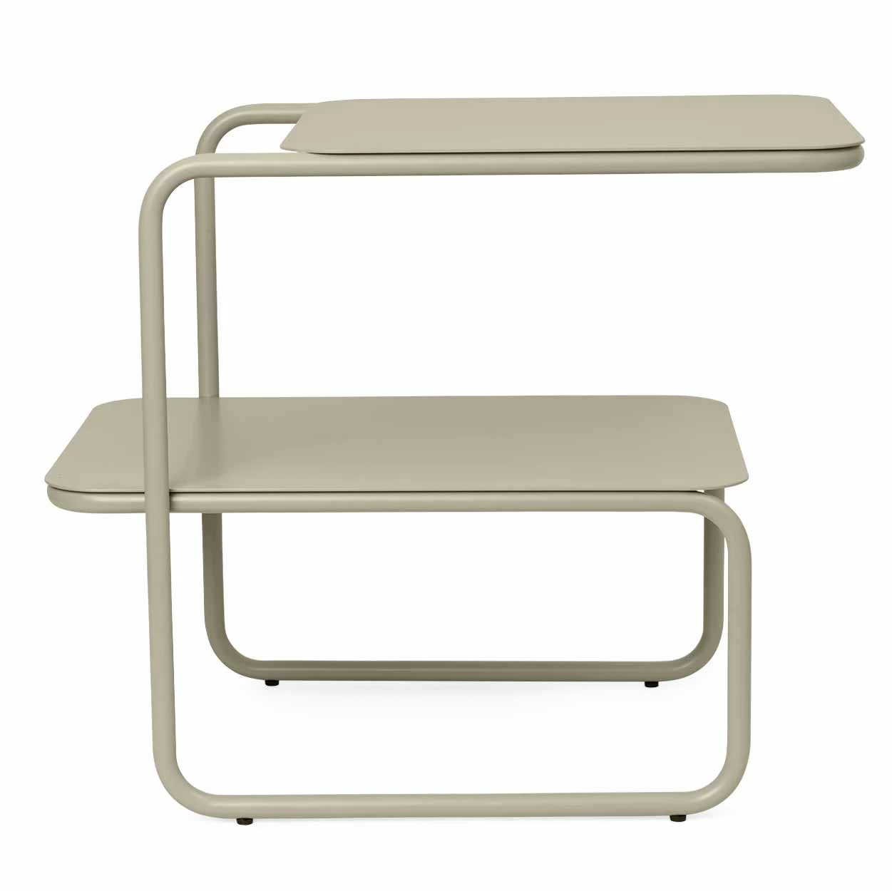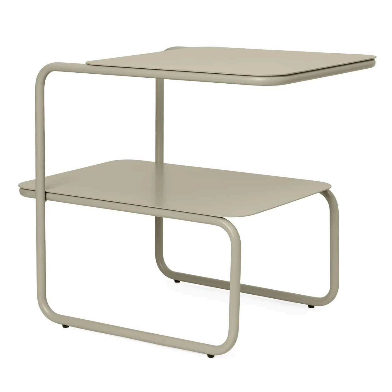 With its intriguing, asymmetrical profile, the Level Side Table presents a modern expression based on a solitary geometric form: its frame a single, continual line. With two levels that offer ample surface space, the table is ideal for extra storage. The side table is crafted from powder coated steel, and can be used both indoors and out.