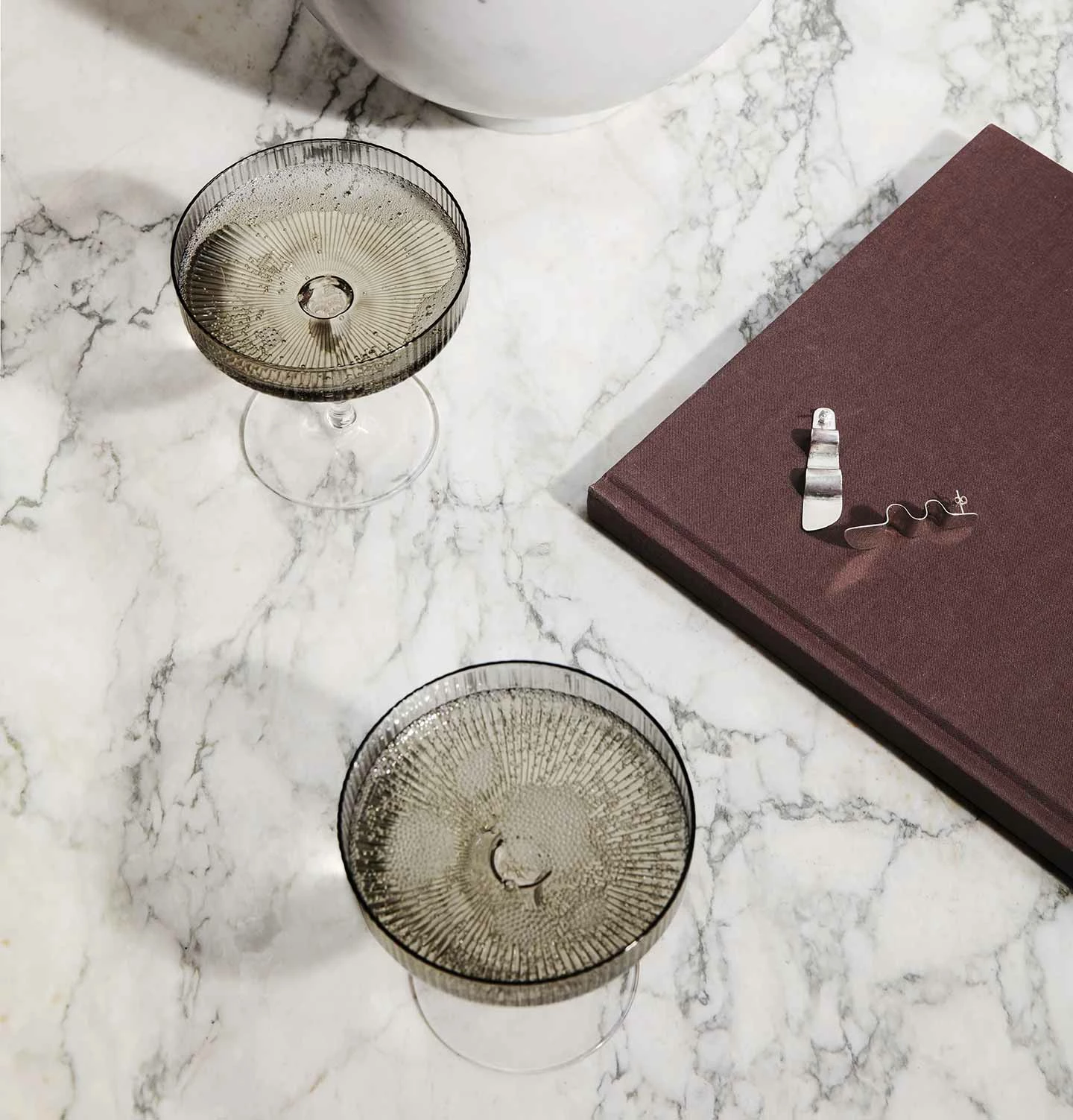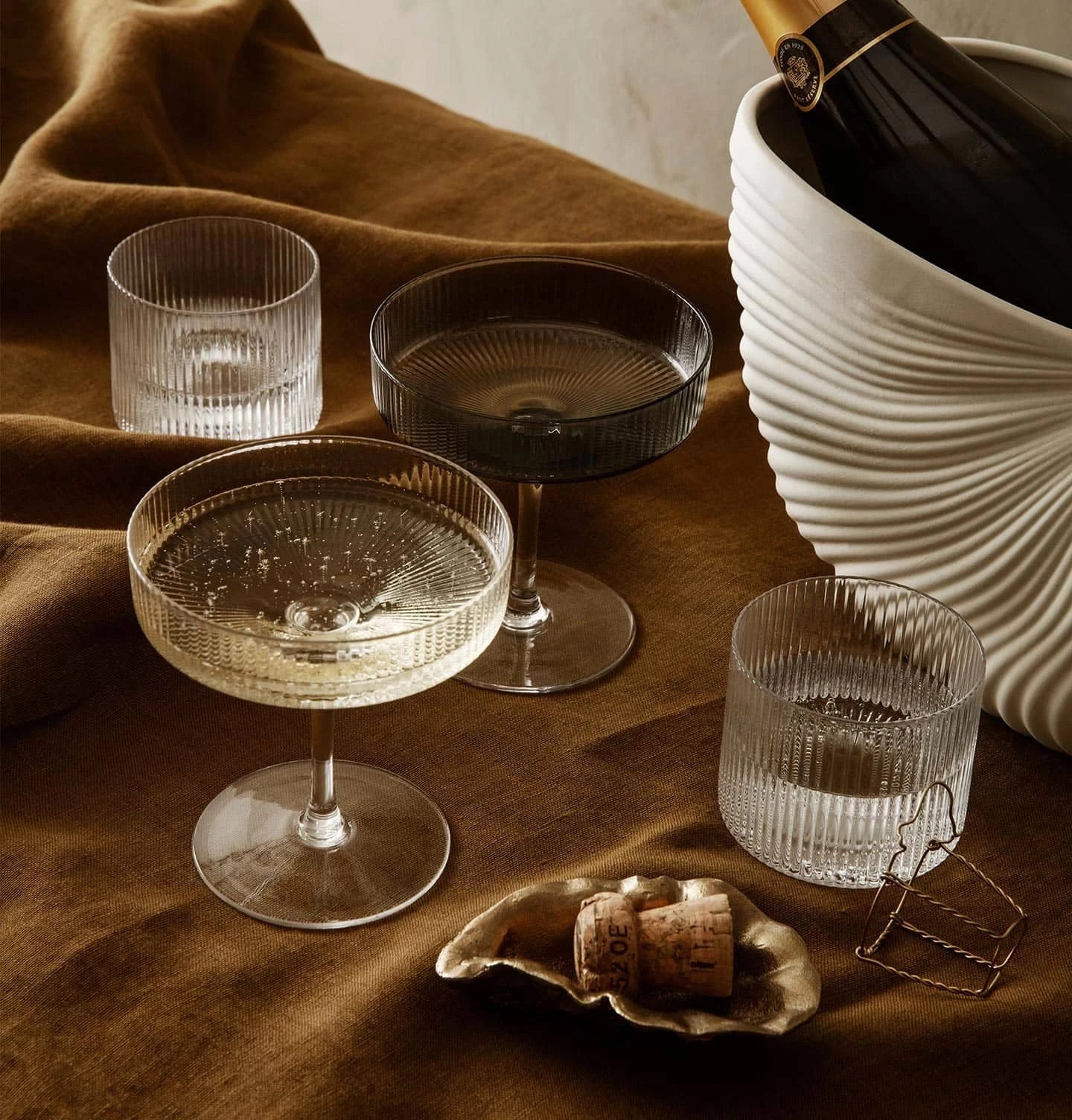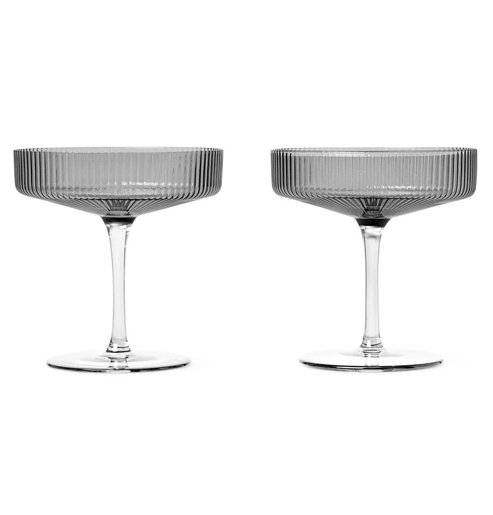 Featuring a beautifully rippled surface the set of Ripple Champagne Saucers presents a tinted glass in a classic design for sparkling wines. They are made of delicate tinted glass mouth-blown into the mould, adding a dynamic and energetic expression to the glasses. Every glass is mouth-blown and made with love, so variations can occour.