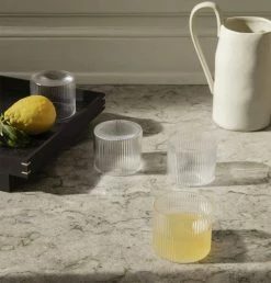 Mouth blown into the mould, this set of four low glasses features a distinctive, beautifully rippled surface. The vertical lines add a strong and sophisticated look to their understated, classic form and are perfect for casual dining. Pair them with other pieces in the Ripple glass collection for a unified dining experience.