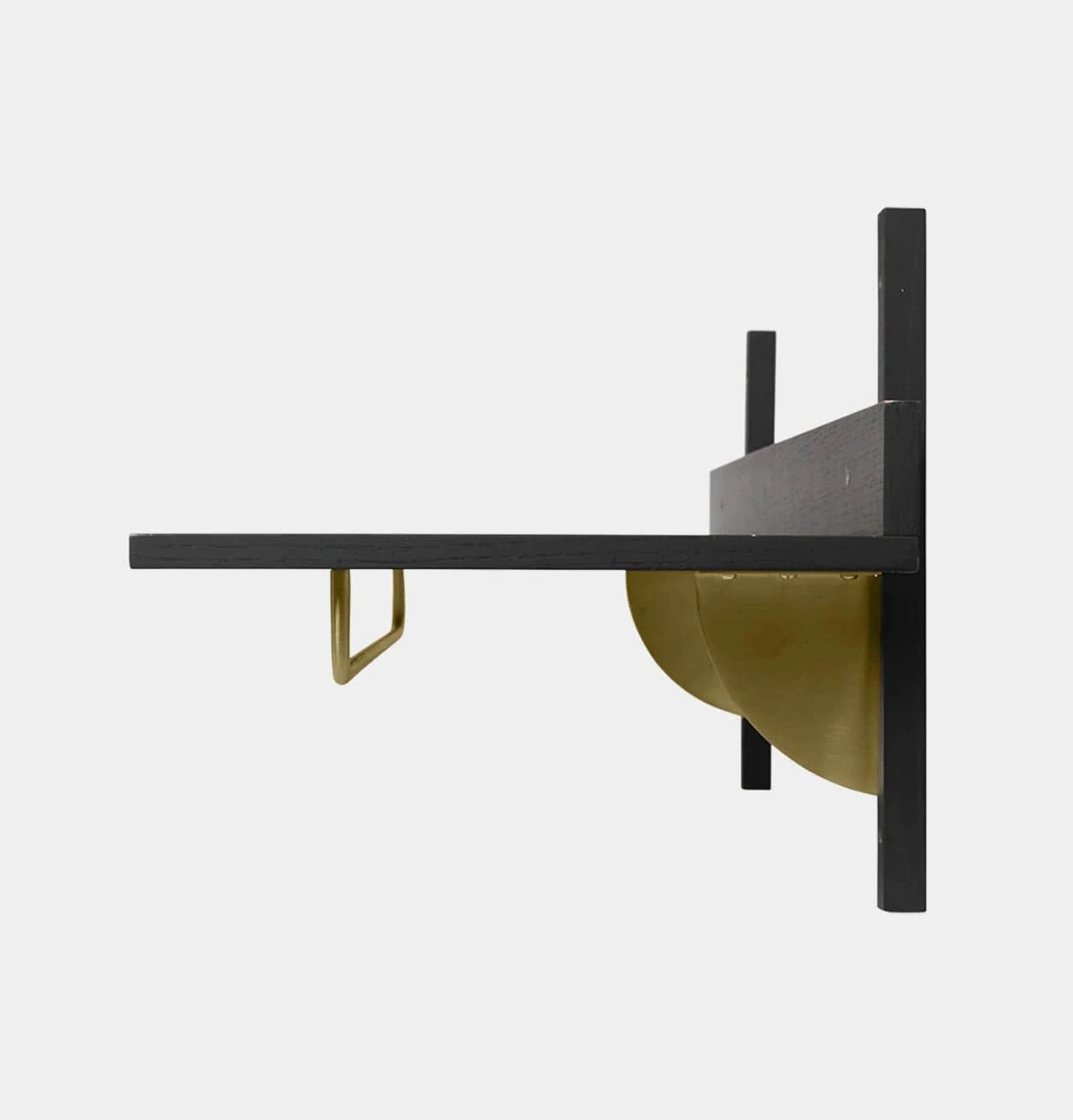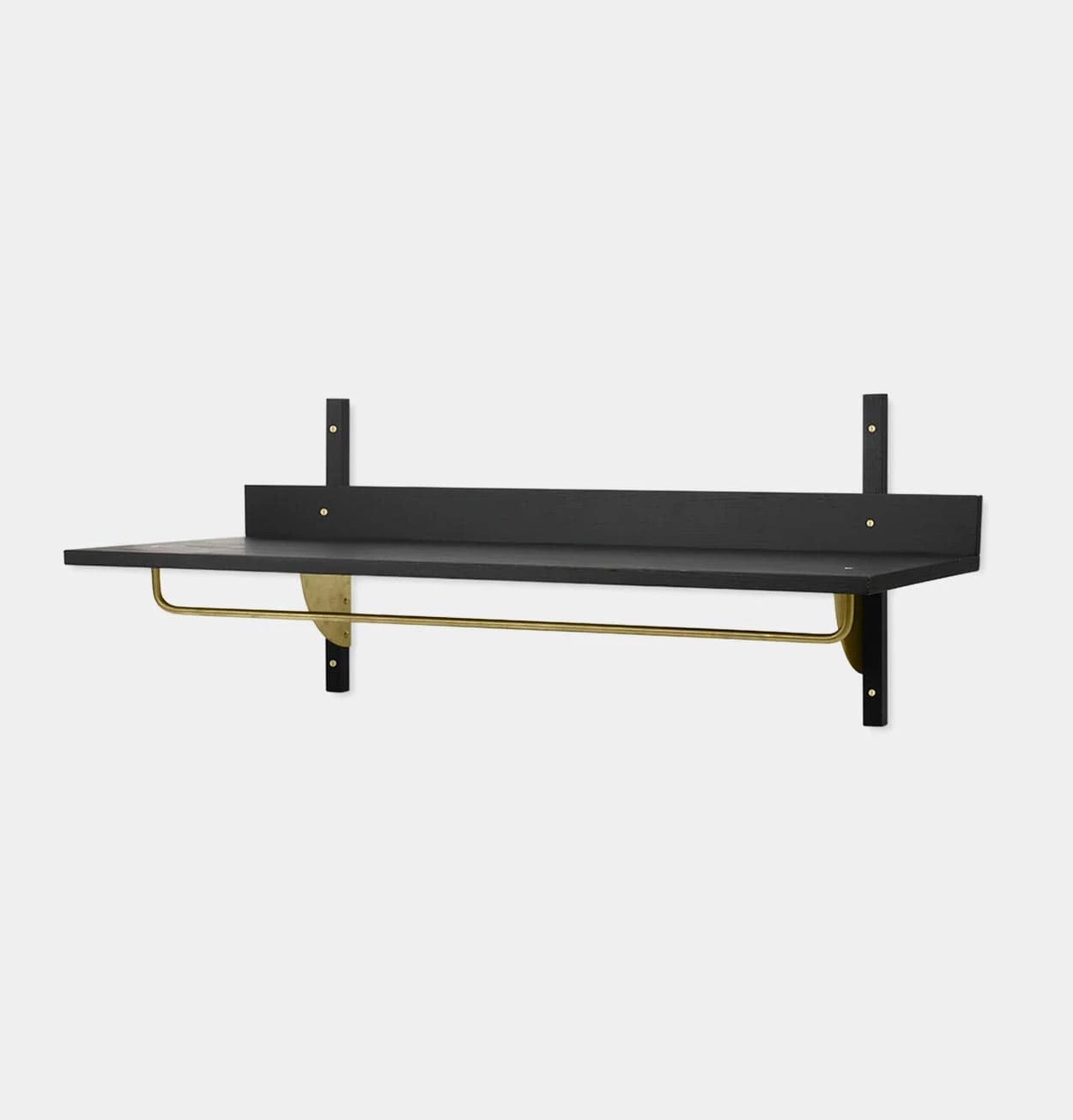 - Material: Shelf: Black stained ash veneer with MDF core. Profiles: Black stained solid ash. Brackets: Brass