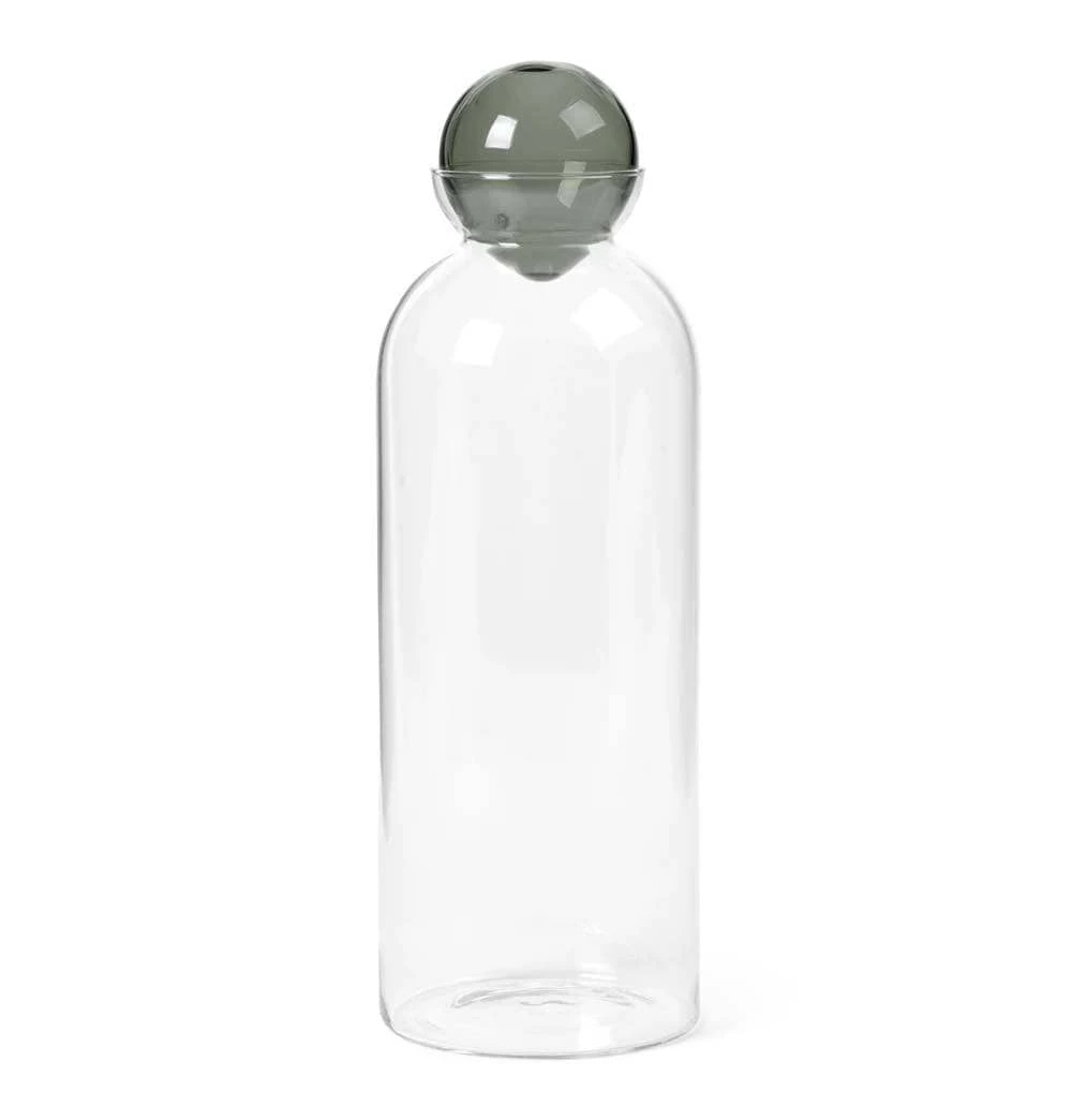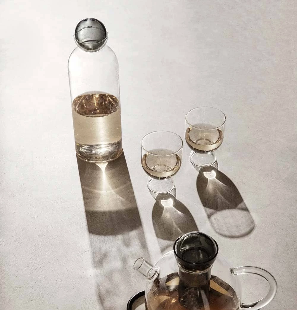 The Still series of glass tableware looks to traditional tea making rituals, simplicity and balance to create everyday objects rooted in beauty and function. The sphere-shaped coloured glass stopper sits like a bubble of air on top of the mouth-blown carafe, designed to elegantly hold water, juice or other liquids. Made for everyday use, pair it with the matching glasses to create a stylish set.