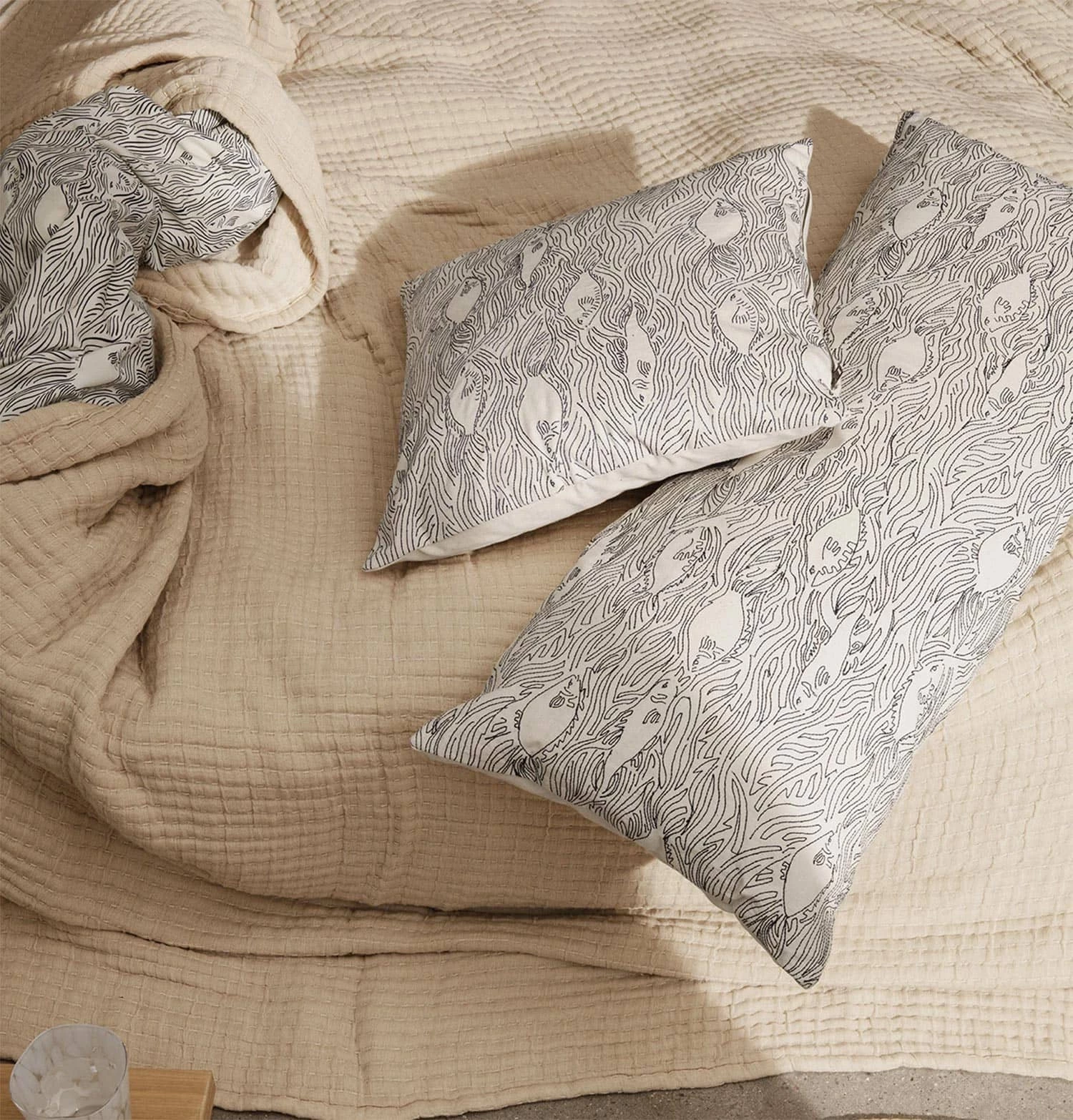 The Stream Cushions feature an abstract, playful print inspired by a Japanese aesthetic that captures the motion of swimming fish and the soothing, endless flow of water. Embroidered in a contrasting colour onto a pillowcase of raw, 100% GOTS-certified organic cotton, the cushion makes a cuddly and stylish addition that can be used both in the kid’s room and in your shared spaces.