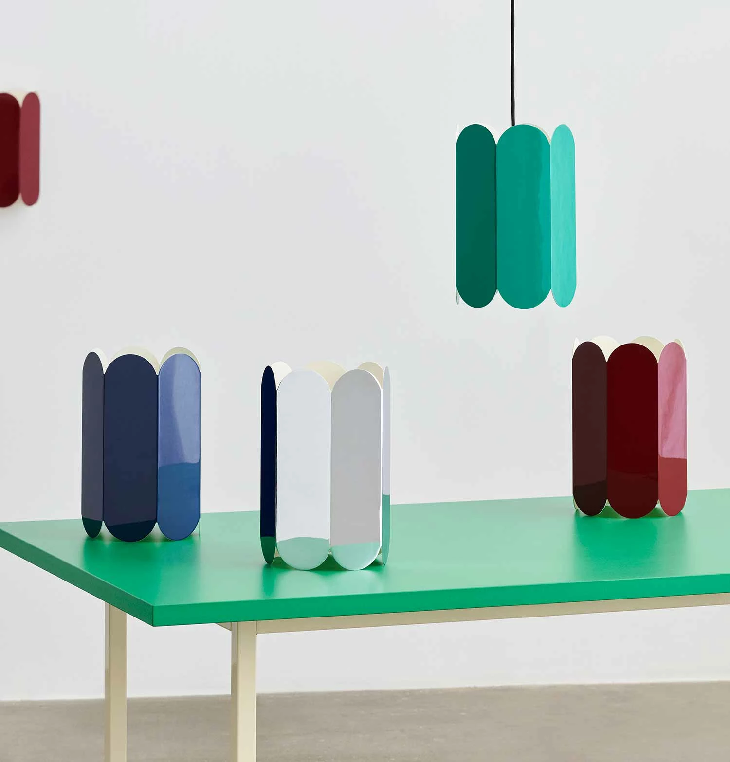 Arcs Shades are part of a series of arched designs created for HAY by Belgian duo Muller Van Severen. Formed from a continuous chain of curved arches that form a single element, the Arcs Shade creates a spatial volume that plays with light and shape. The shade can be used as a table lamp or pendant lamp suspended from the ceiling, both options forming contrasts in depth, colour and shape, resulting in an elegant scalloped silhouette. Crafted in steel, Arcs is available in several different colours or with a mirror surface. The cord sets for the shades are sold separately and are available in two designs – a table/floor variant with an in-line on/off rocker switch, and a pendant variant for ceiling lamps. The cord sets are not supplied with a bulb.