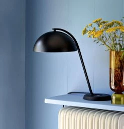 Cloche is a table top lamp providing a directional light. Its black powder coated arm and off-set cast iron base creates a visual imbalance, resembling the suspension of a traditional dining cloche. The shade is available in more colours.