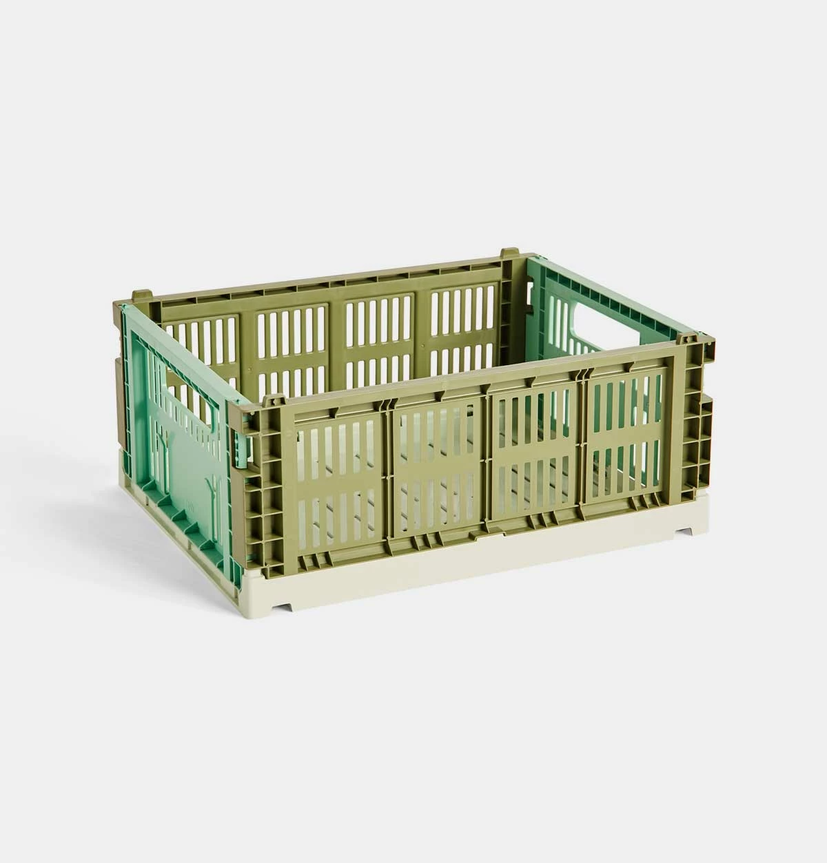 HAY Colour Crate Mix is a series of colourful storage boxes with a distinctive, perforated design. Made from 100% recycled post-consumer plastic waste in a variety of different colour-blocked designs and sizes, the crates can be stacked on top of one another in different size combinations. The multifunctional crates are suitable for storing and organising a wide range of items on shelves, tables or inside cupboards.