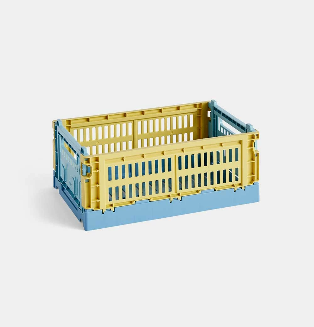 HAY Colour Crate Mix is a series of colourful storage boxes with a distinctive, perforated design. Made from 100% recycled post-consumer plastic waste in a variety of different colour-blocked designs and sizes, the crates can be stacked on top of one another in different size combinations. The multifunctional crates are suitable for storing and organising a wide range of items on shelves, tables or inside cupboards.