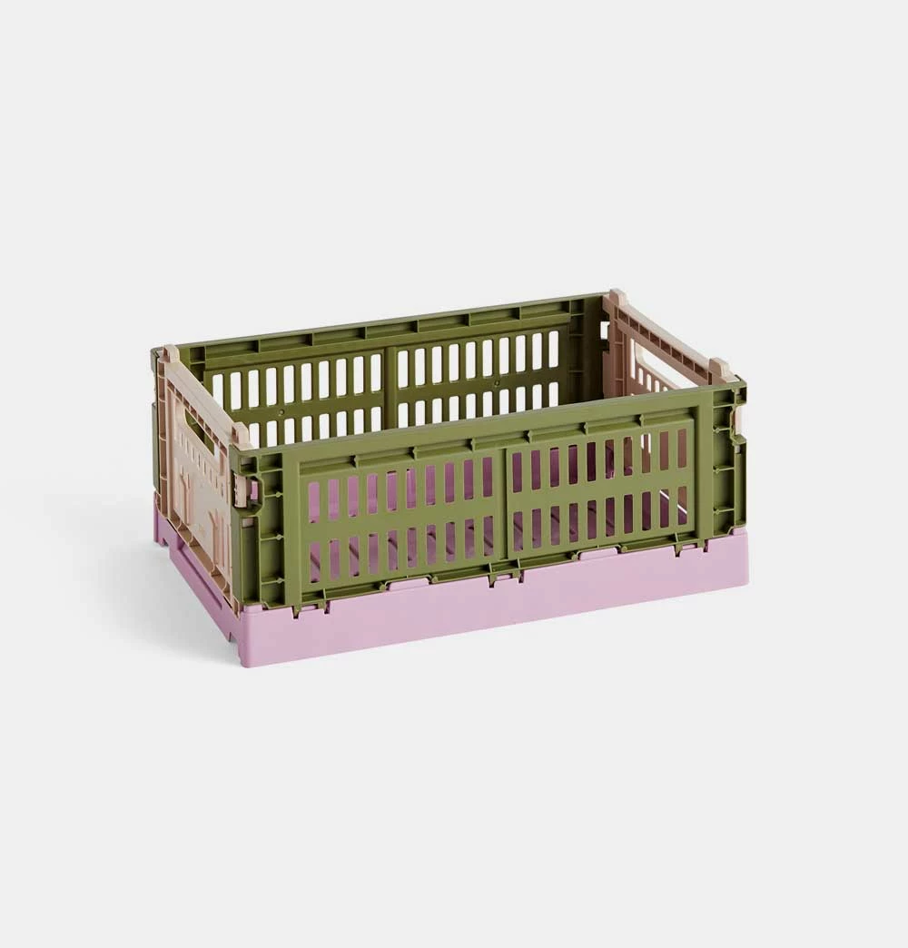 HAY Colour Crate Mix is a series of colourful storage boxes with a distinctive, perforated design. Made from 100% recycled post-consumer plastic waste in a variety of different colour-blocked designs and sizes, the crates can be stacked on top of one another in different size combinations. The multifunctional crates are suitable for storing and organising a wide range of items on shelves, tables or inside cupboards.