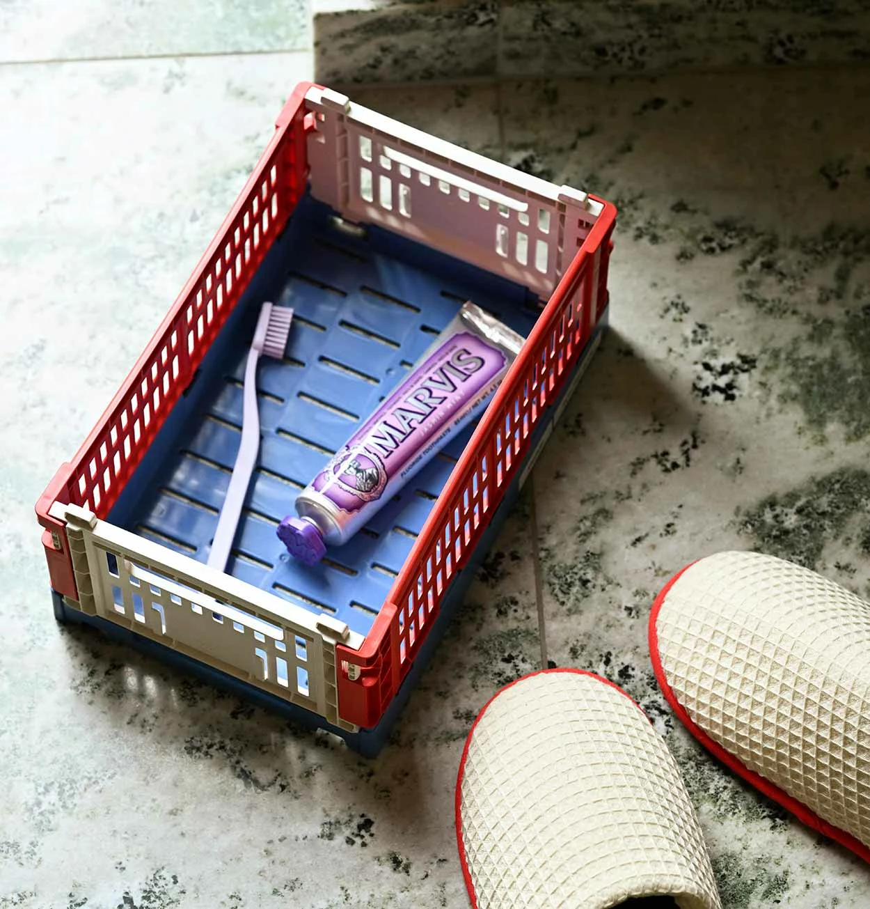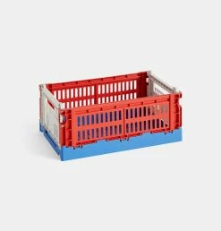 HAY Colour Crate Mix is a series of colourful storage boxes with a distinctive, perforated design. Made from 100% recycled post-consumer plastic waste in a variety of different colour-blocked designs and sizes, the crates can be stacked on top of one another in different size combinations. The multifunctional crates are suitable for storing and organising a wide range of items on shelves, tables or inside cupboards.