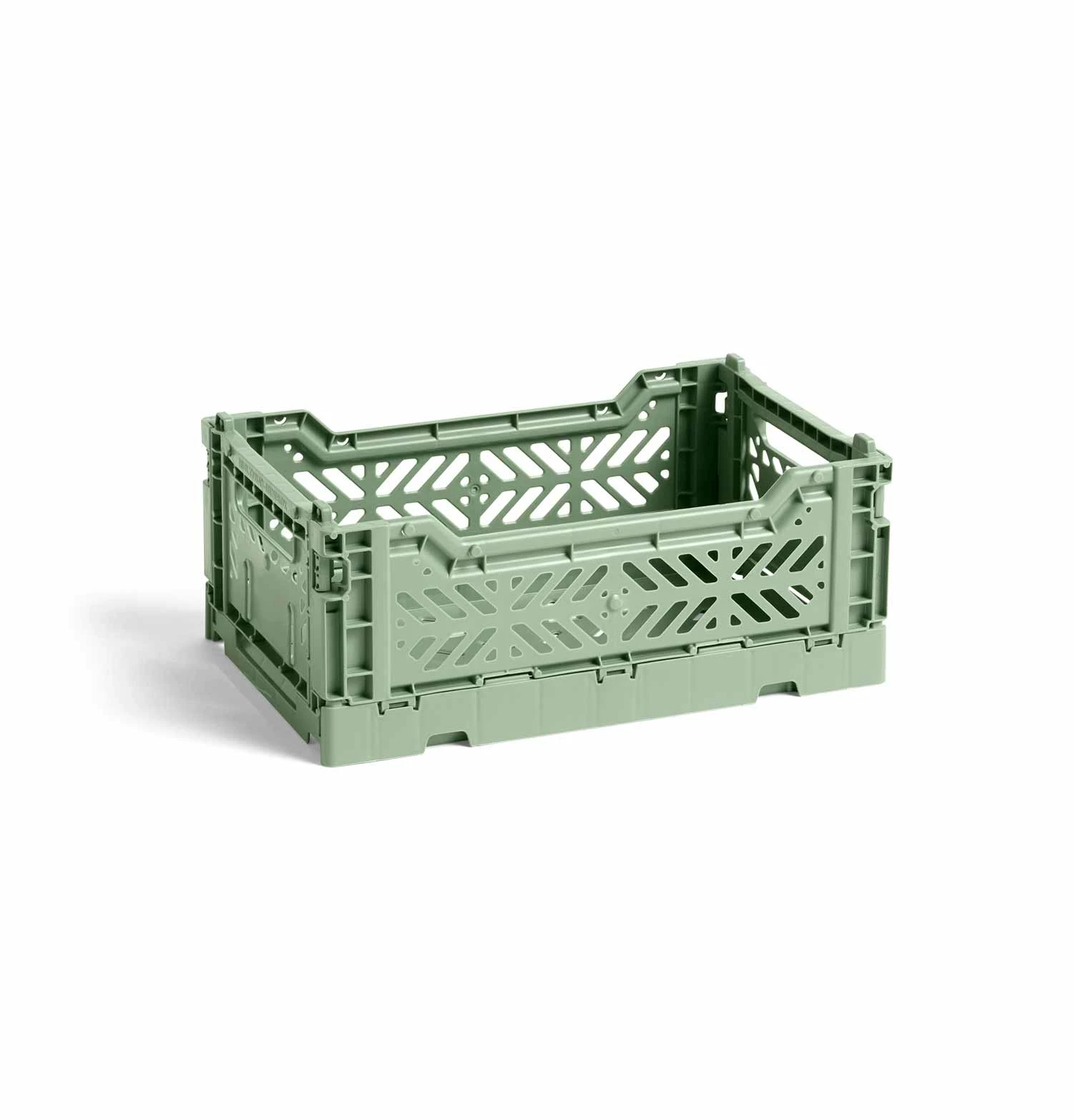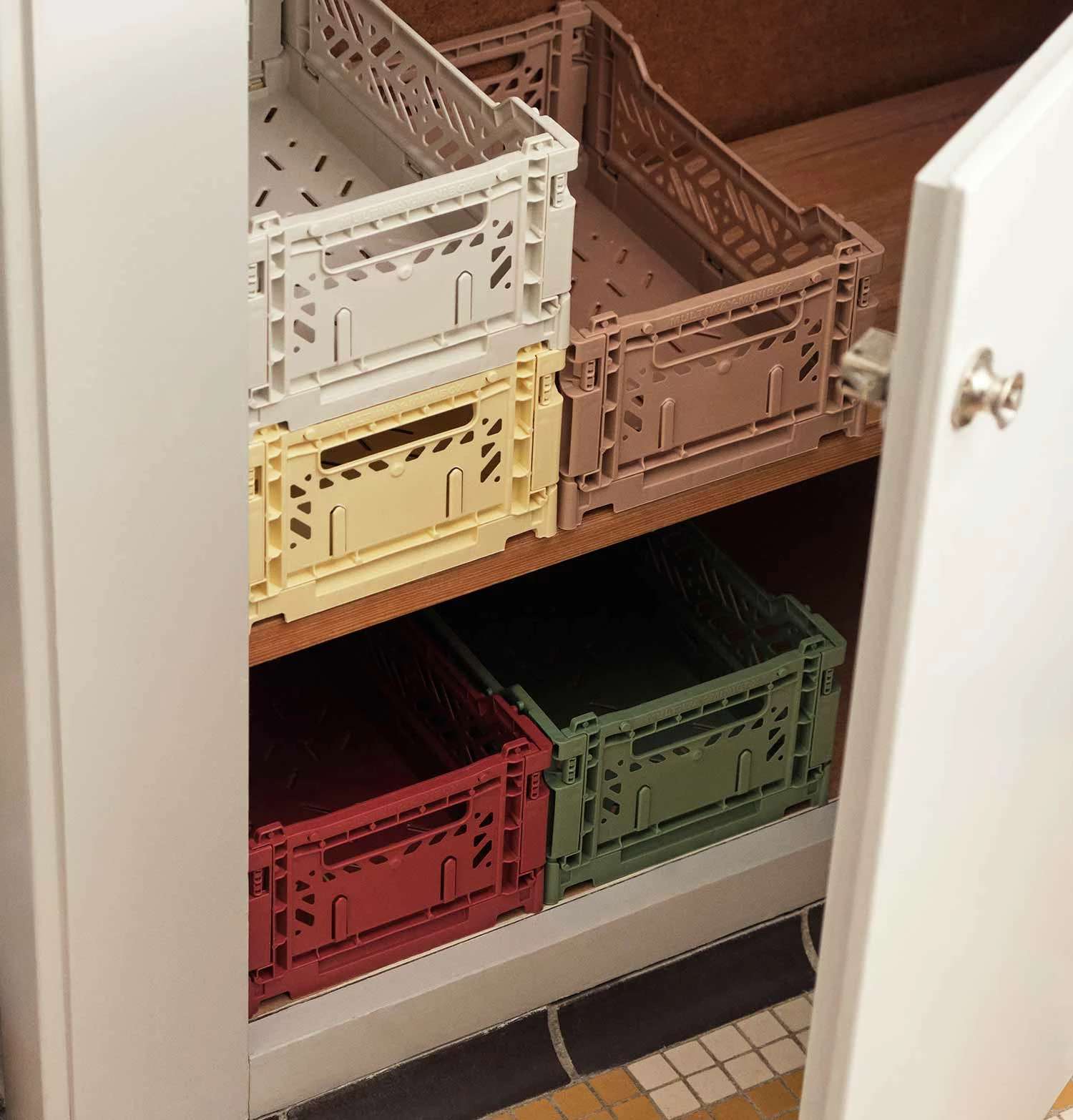 Multifunctional plastic crate with ventilated and stackable design in a variety of different colours and sizes.