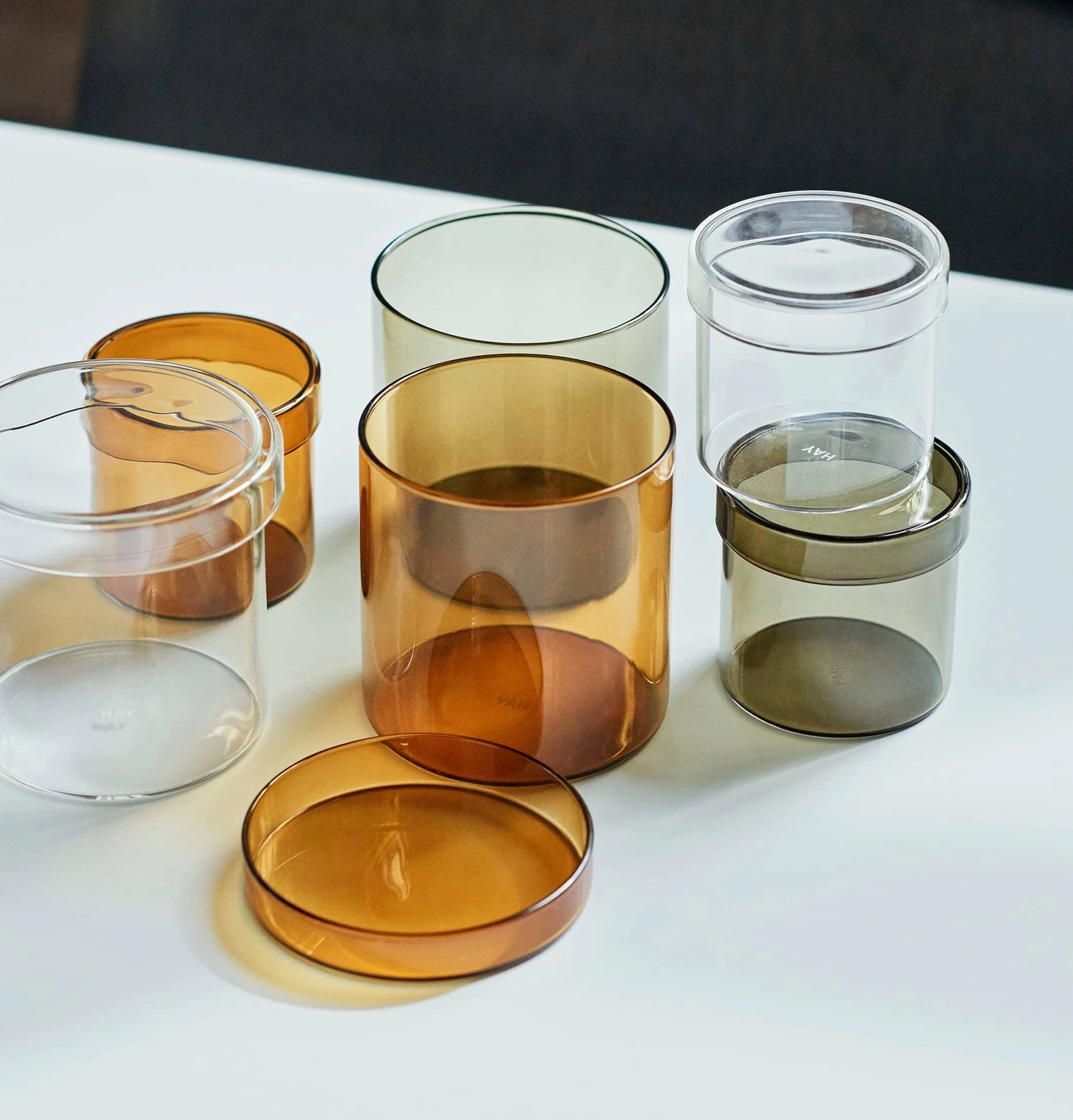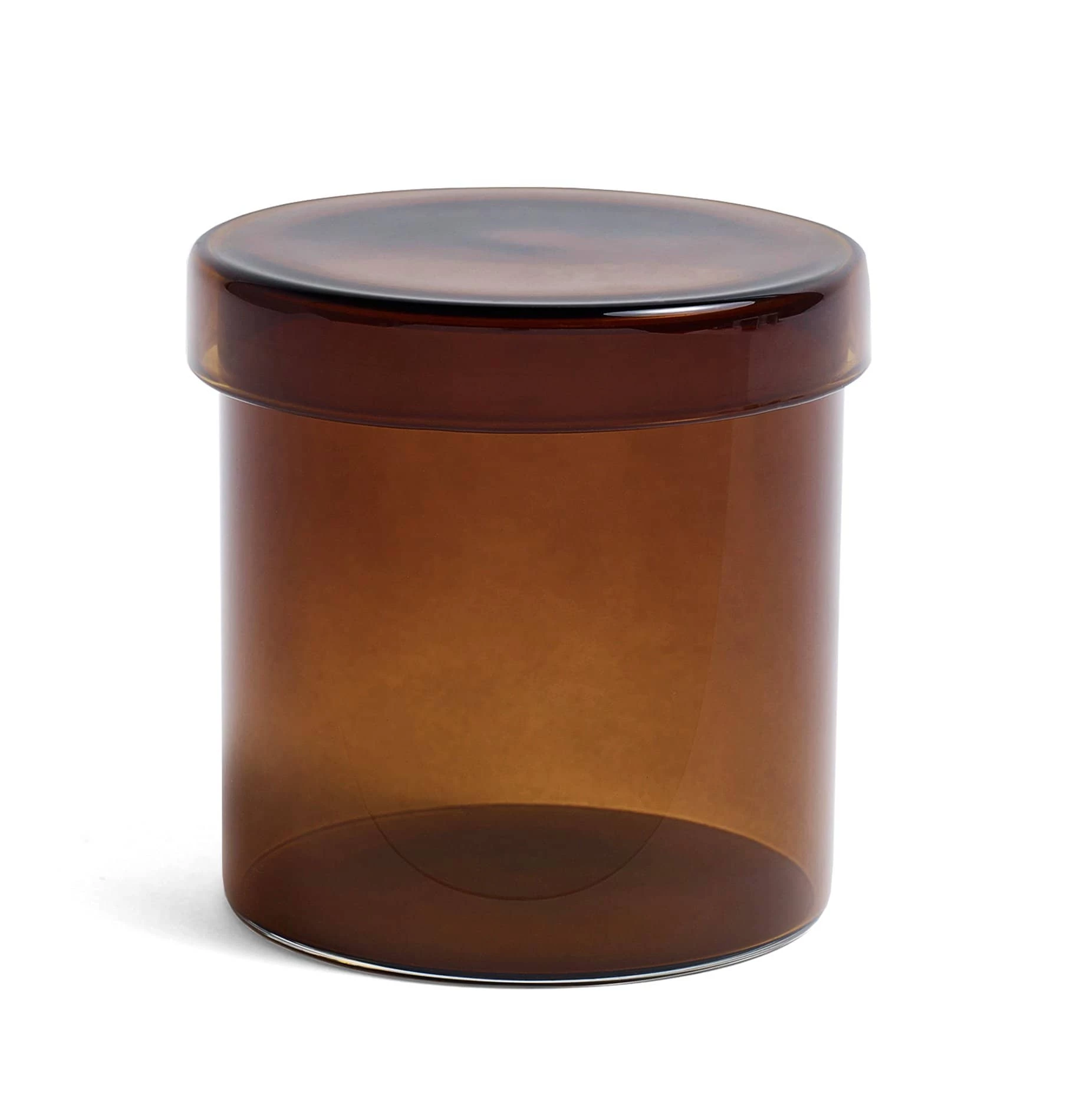The HAY Container is a practical glass jar with matching lid designed for organising and storing small items. Available in two sizes in three different tones of glass.