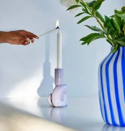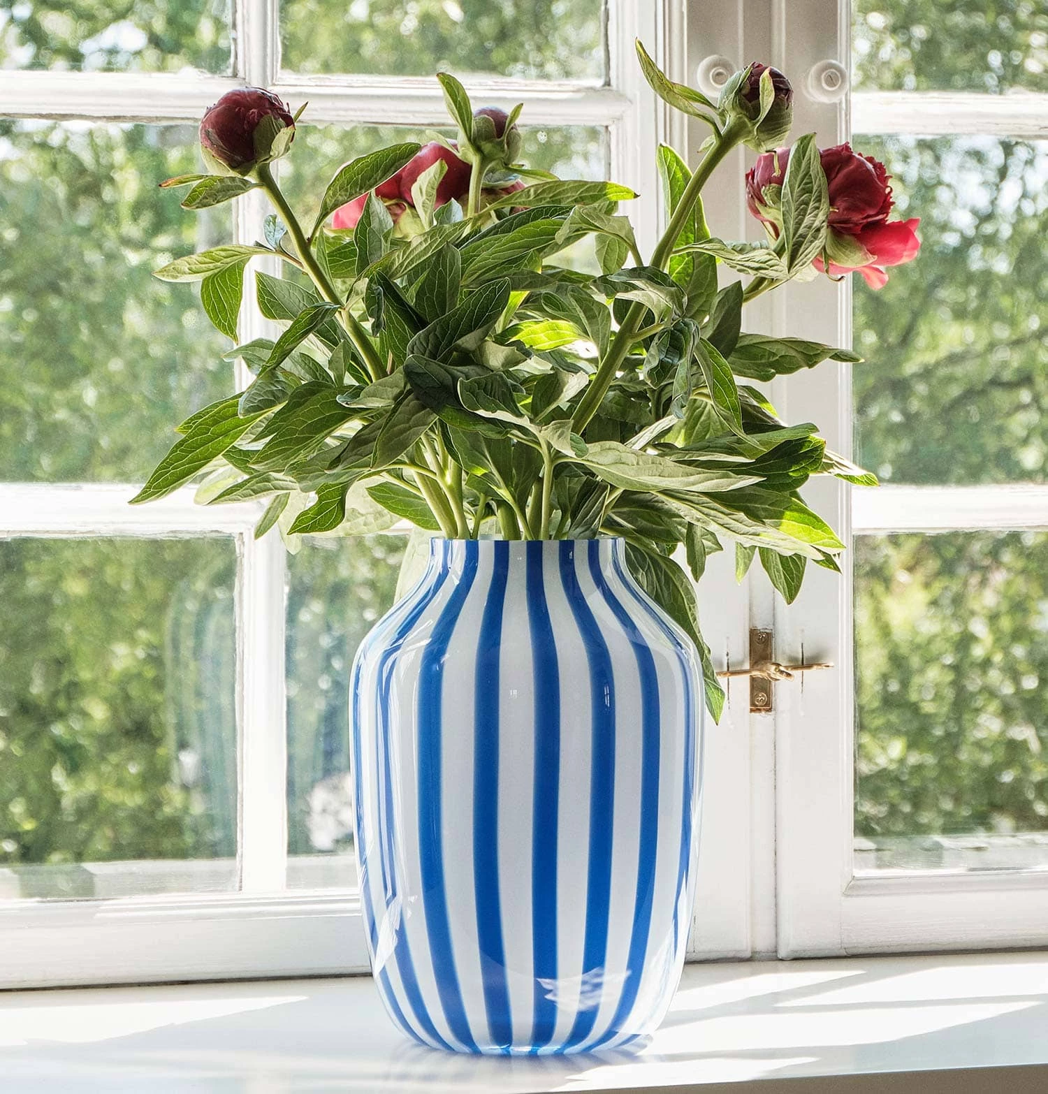 Vertical opaque and clear stripes create a subtle colour variance in Kristine Five MelvΓ¦rβs glass vase collection. Available in two sizes in three different colour combinations.