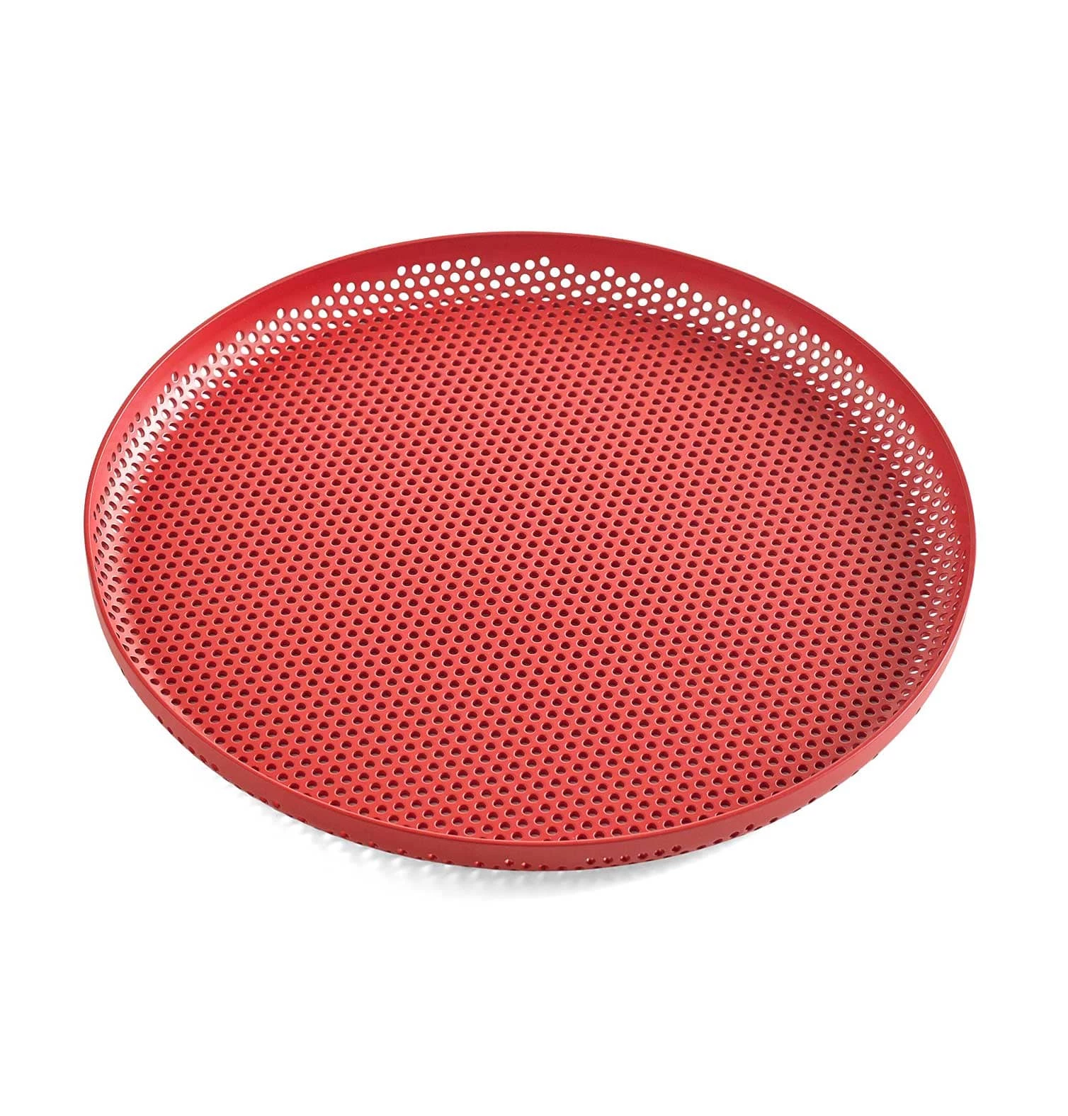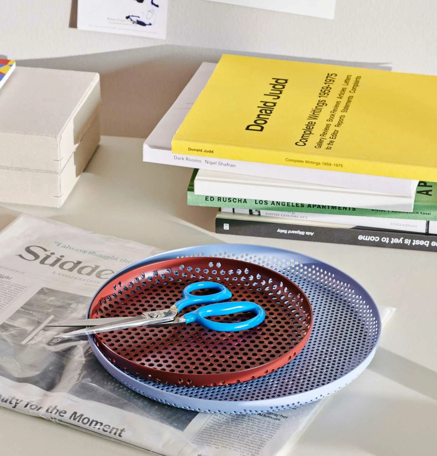 Lex Pott for HAY’s round Perforated Tray uses hundreds of tiny circular holes to create a structured effect. The round tray features curved, slightly raised sides for extra stability when carrying or displaying items. Made in aluminium in three sizes, and available in a variety of different colours.
