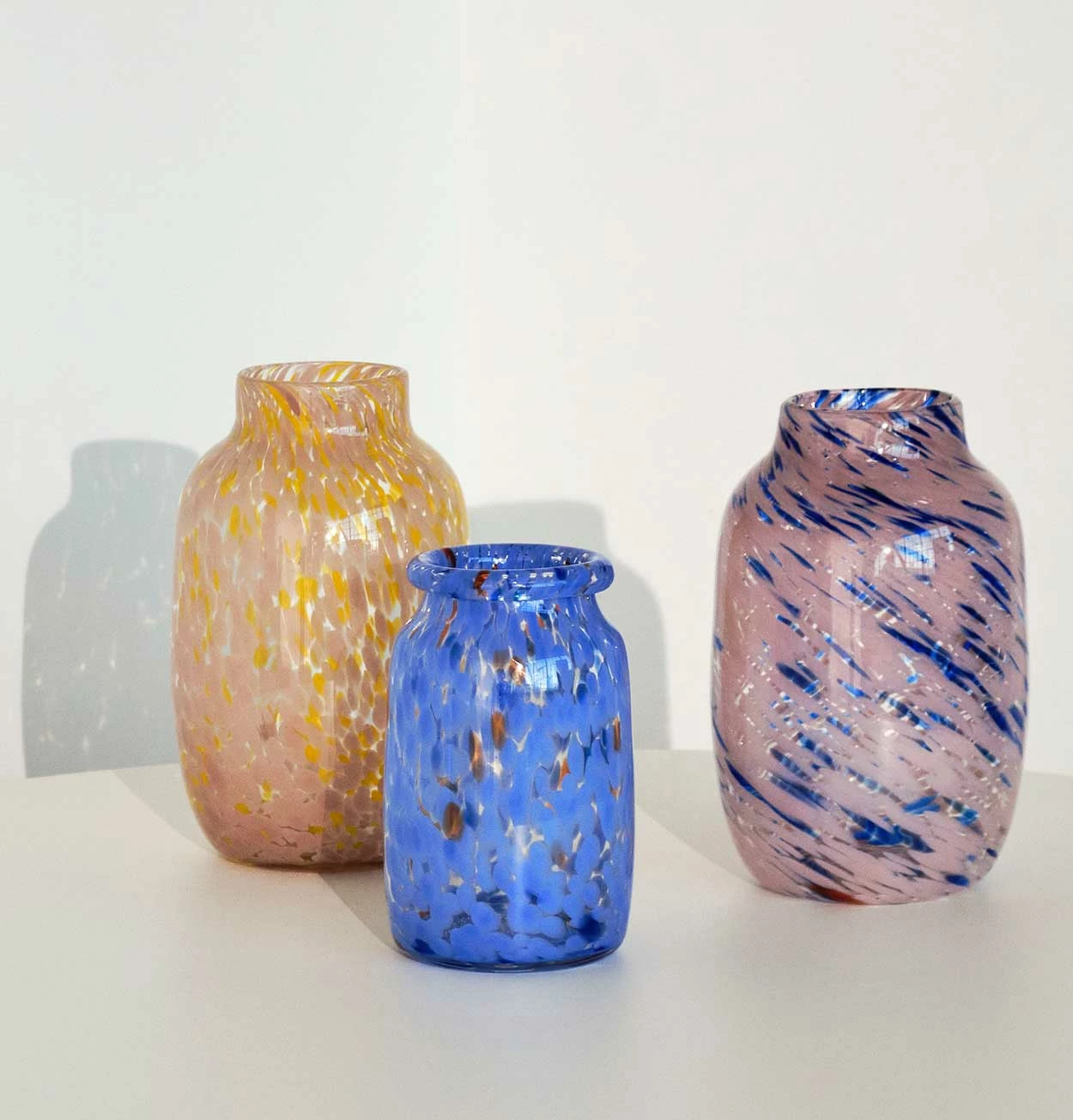 Handmade using a special glassblowing technique that involves multiple layers of coloured glass dots, the Splash Vase features a unique swirled pattern. Available in different designs and sizes, the vases can be used both for displaying flowers and as decorative objects.