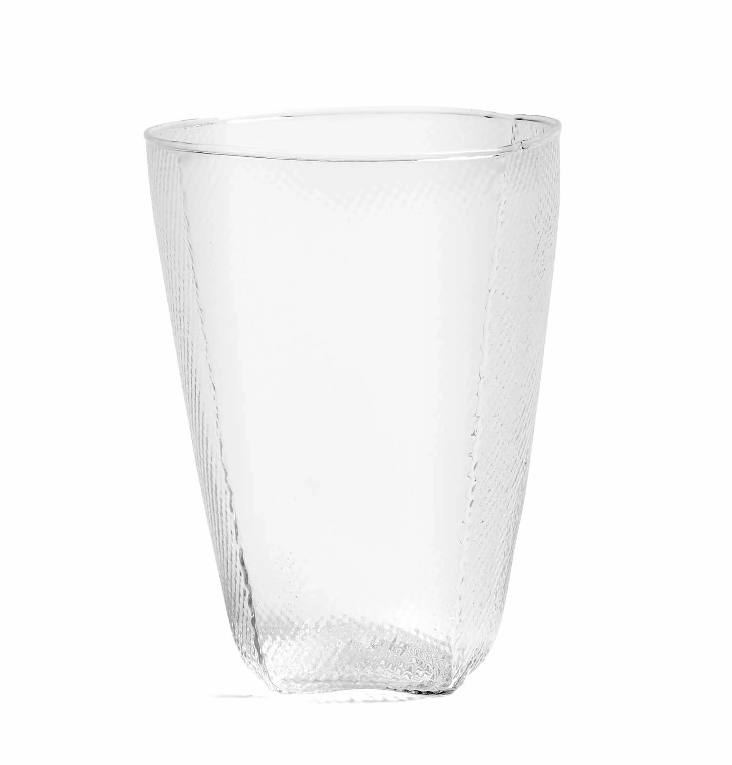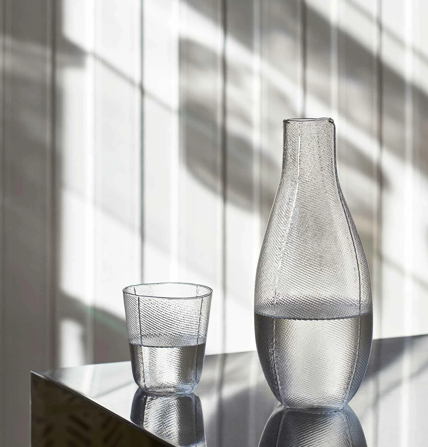 Tela Glassware was originally formed by experimenting with blowing molten glass into stitched textile bags. Light, strong and with beautiful detailing, the collection has a distinctive handmade character, yet is suitable for everyday use.