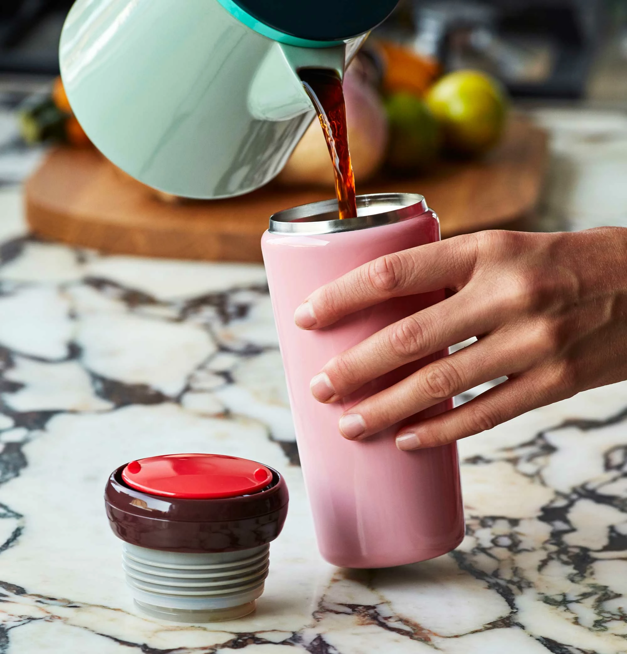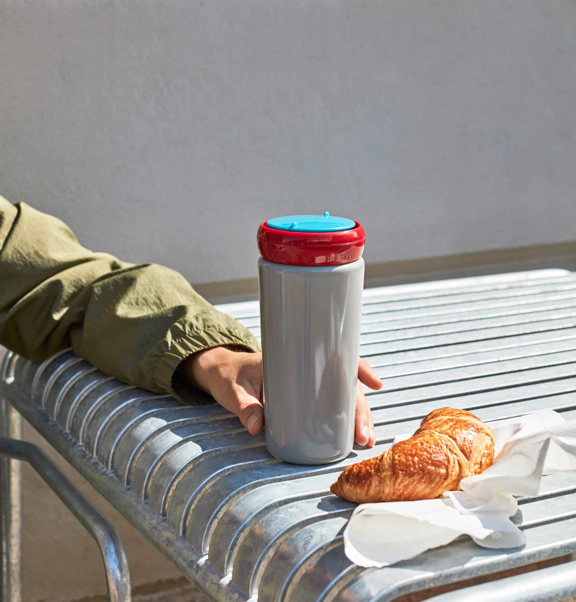 Contrasting colours make for a playful expression in George Sowdenβs Travel Mug. Crafted in stainless steel with a plastic lid, the functional design is suitable for containing hot and cold drinks.